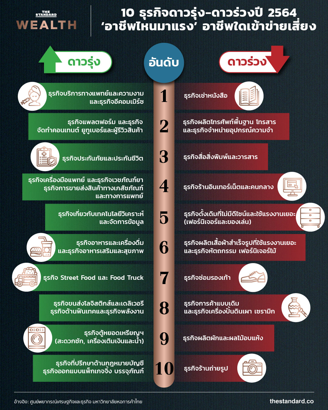 ศูนย์พยากรณ์เศรษฐกิจและธุรกิจ มหาวิทยาลัยหอการค้าไทย ได้เปิดเผยผลการวิจัยทางธุรกิจเพื่อจัดลิสต์ 10 อันดับดาวรุ่งและดาวร่วงประจำปี 2564 โดยอิงจากเกณฑ์การให้คะแนนใน 5 ส่วน ประกอบด้วย ยอดขาย, ต้นทุน, กำไรสุทธิ, ผลกระทบจากปัจจัยเสี่ยงและภาวะการแข่งขัน และความต้องการ ความสอดคล้องกับกระแสนิยม โดยมีรายชื่อกลุ่มธุรกิจในลิสต์ดังนี้