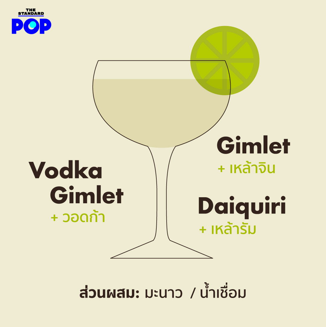 Vodka Gimlet: วอดก้า 2 ส่วน + มะนาว ¾ ส่วน + น้ำเชื่อม ½ ส่วน = ใส่ส่วนผสมลงในเชกเกอร์ ใส่น้ำแข็ง เชกให้เข้ากันดีและเทใส่แก้ว