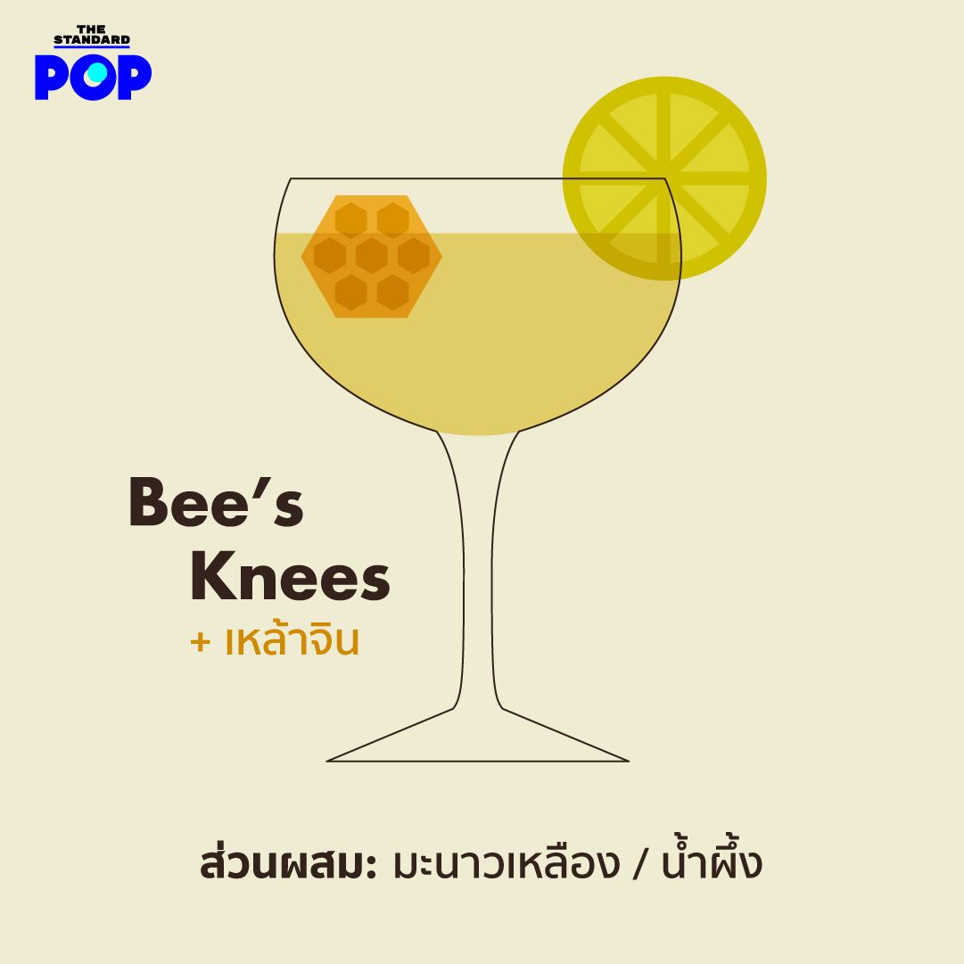 Bee’s Knees: เหล้าจิน 2 ส่วน + มะนาวเหลือง ¾ ส่วน + น้ำผึ้ง ½ ส่วน = ใส่ส่วนผสมลงในเชกเกอร์ ใส่น้ำแข็ง เชกให้เข้ากันดีและเทใส่แก้ว