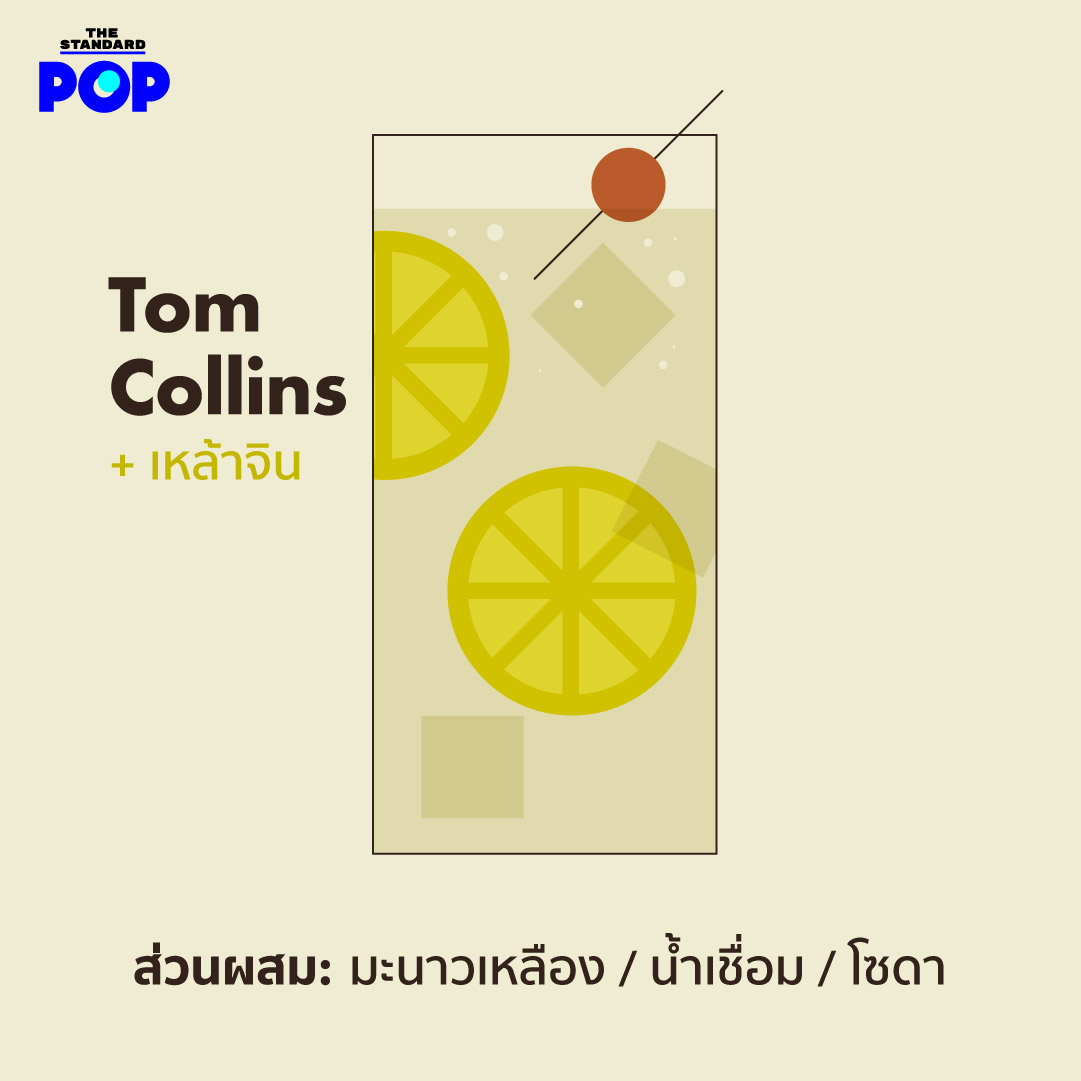 Tom Collins เป็นอีกหนึ่งจินค็อกเทลที่ยังวนเวียนอยู่กับสามส่วนผสมมาตรฐานคือ เหล้า มะนาว และน้ำตาล แต่แทนที่จะเชกแล้วเทลงแก้วจิบเย็นๆ เพิ่มความสดชื่นด้วยโซดา ใส่น้ำแข็งเต็มๆ แก้ว จิบกันยาวๆ แบบ โอ้โห สดชื่นจัง