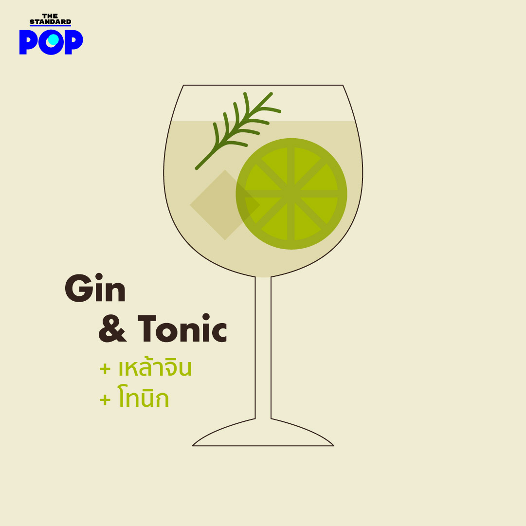 Gin & Tonic: เหล้าจิน 2 ส่วน + โทนิก 4 ส่วน = เราอยากให้คุณเลือกใช้แก้วแบบในภาพ หรือแก้วทรงสูง ใส่น้ำแข็งไม่เต็มแก้ว ผสมจินและโทนิกเข้าด้วยกัน