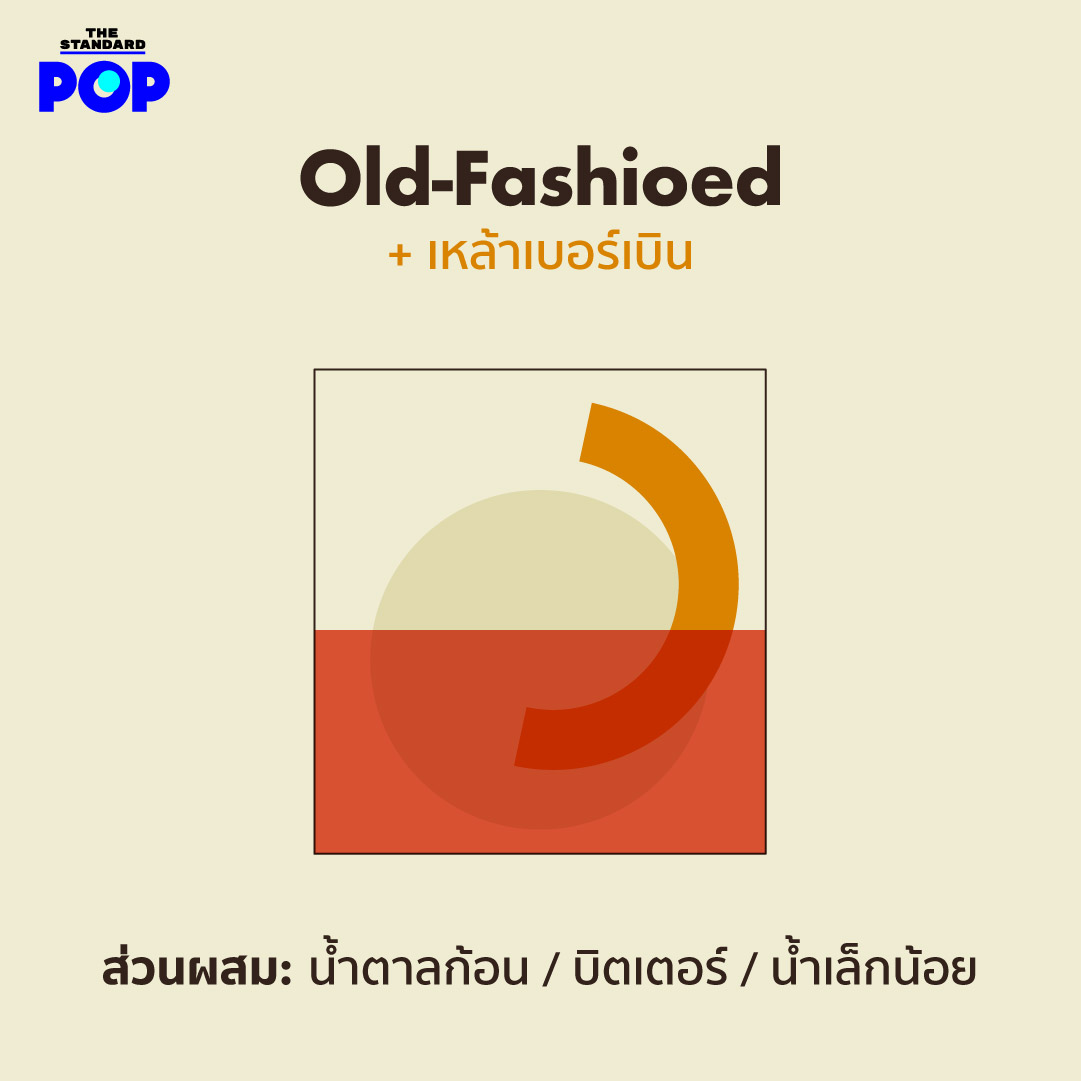 Old-Fashioed: เหล้าเบอร์เบิน + น้ำตาลก้อน + บิตเตอร์ + น้ำเล็กน้อย = หยิบแก้ววิสกี้ที่คุณชอบ ใส่น้ำตาลก้อน หยดบิตเตอร์สัก 2 หยดและน้ำเปล่าเล็กน้อย คนให้น้ำตาลละลาย ก่อนใส่น้ำแข็งก้อนใหญ่ เติมเบอร์เบิน และคนให้เข้ากัน