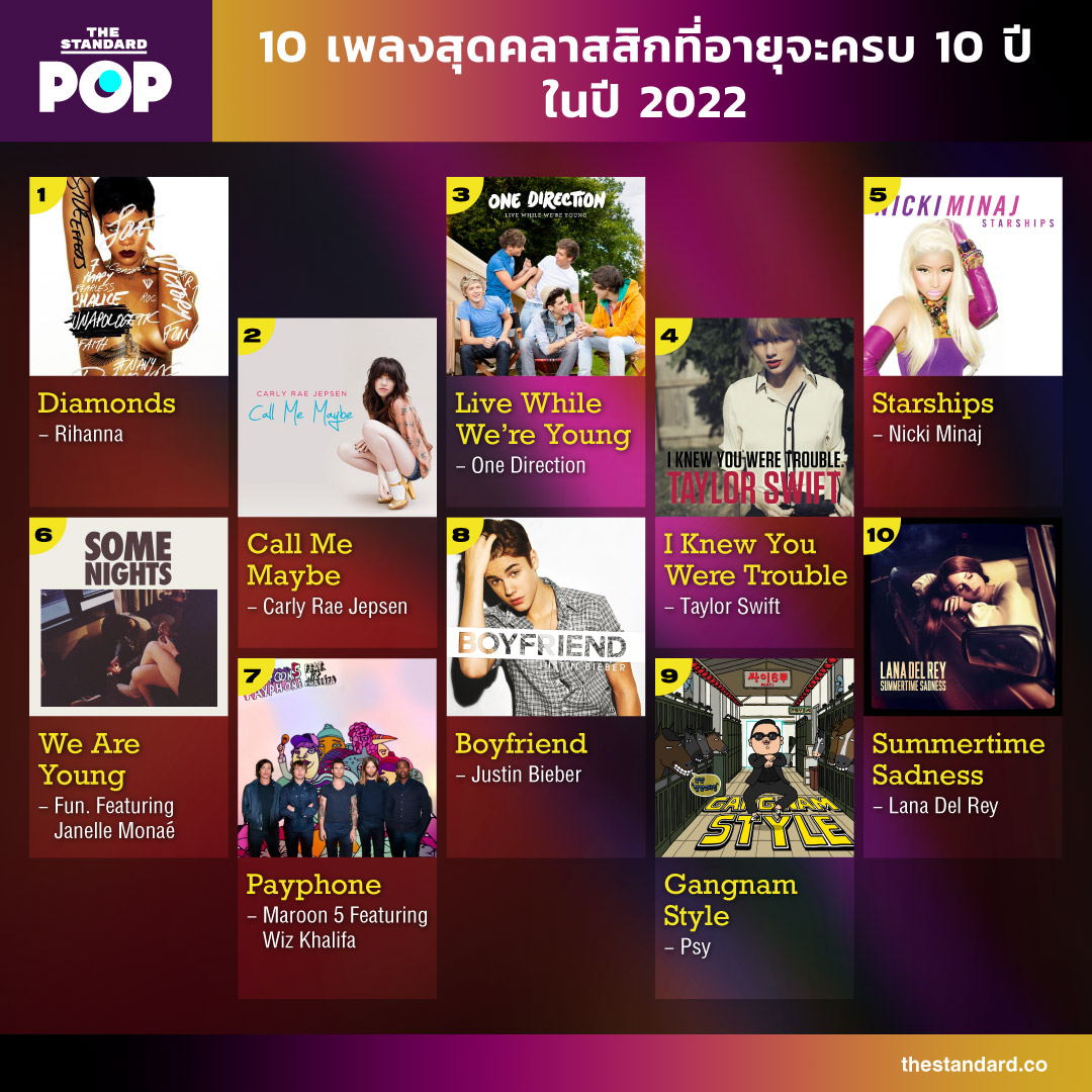 ย้อนกลับไป 10 ปีที่แล้ว เมื่อปี 2012 วงการเพลงป๊อปถือว่าคึกคักอย่างมาก โดย Rihanna ก็ยังเป็นนักร้องฟูลไทม์ที่ปล่อยผลงานเพลงใหม่ออกมาทุกปี หนุ่มๆ วง One Direction ก็ยังคงประสบความสำเร็จอย่างถล่มทลายจนกลายเป็นหนึ่งในบอยแบนด์ที่สำคัญสุดในประวัติศาสตร์ และเพลง Gangnam Style ของ Psy ก็ถือว่าเป็นจุดริเริ่มที่ทำให้เพลงเคป๊อปเริ่มเป็นที่สนใจทั่วโลก โดยเฉพาะฝั่งตะวันตก