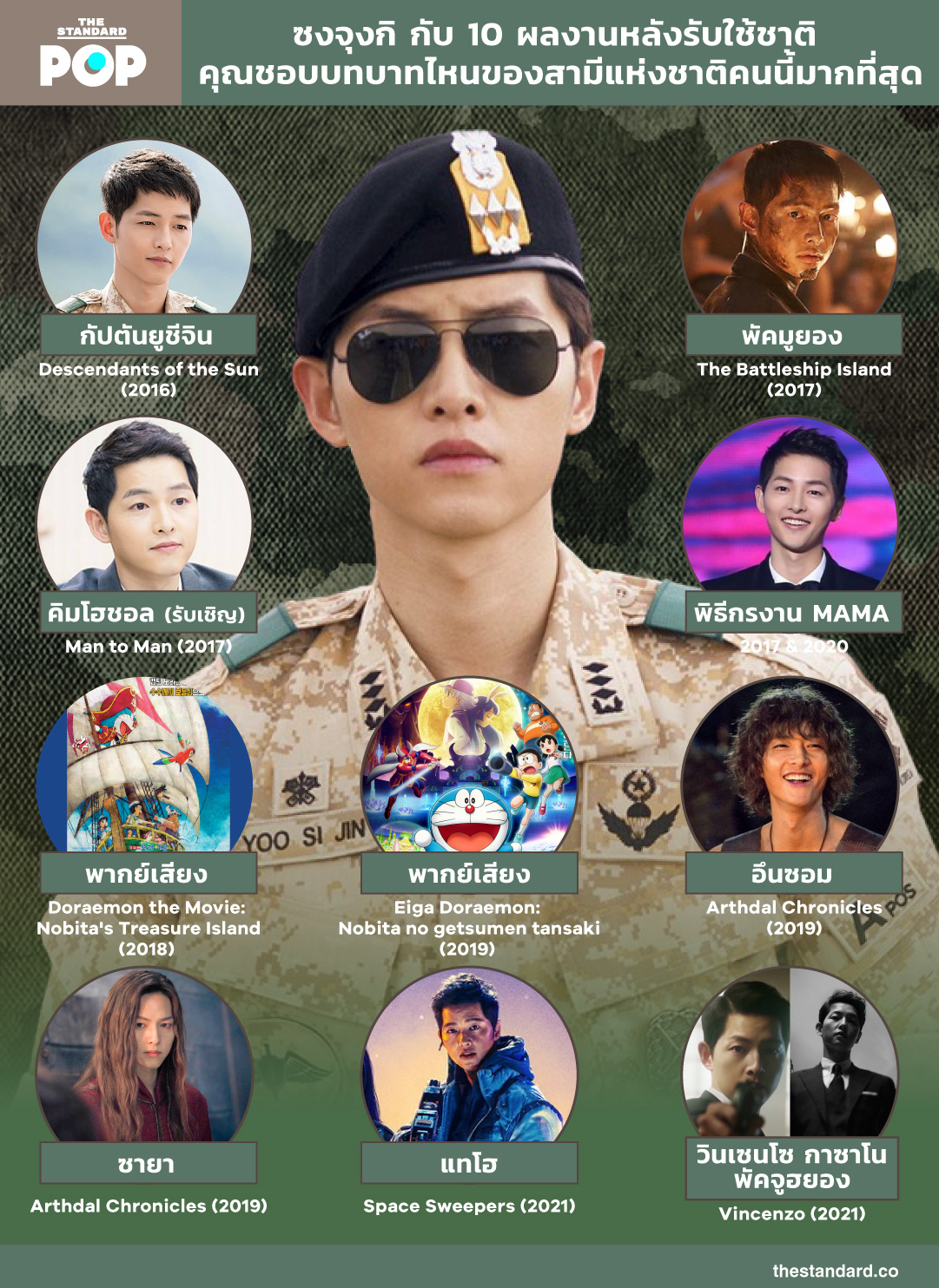 THE STANDARD POP ขอพาทุกคนอุ่นเครื่องย้อนดูผลงานของหนึ่งใน ‘สามีแห่งชาติ’ คนนี้ด้วย 10 ผลงานในวงการบันเทิงเริ่มตั้งแต่ Descendants of the Sun ที่กลับมาให้แฟนๆ หายคิดถึงหลังเสร็จสิ้นภารกิจรับใช้ชาติในปี 2015 มาจนถึงผลงานล่าสุด