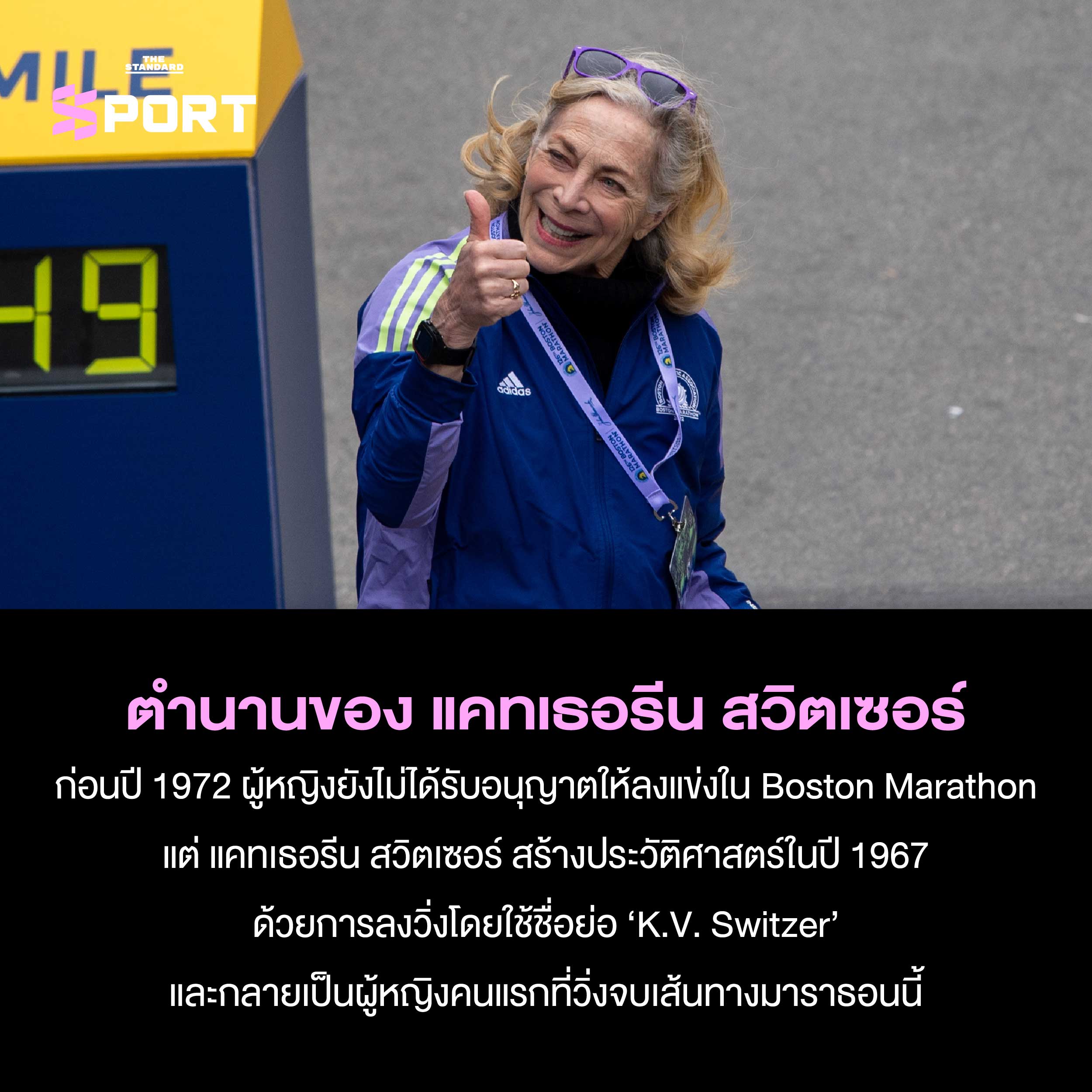 ก่อนปี 1972 ผู้หญิงยังไม่ได้รับอนุญาตให้ลงแข่งใน Boston Marathon แต่ แคทเธอรีน สวิตเซอร์ สร้างประวัติศาสตร์ในปี 1967 ด้วยการลงวิ่งโดยใช้ชื่อย่อ ‘K.V. Switzer’ และกลายเป็นผู้หญิงคนแรกที่วิ่งจบเส้นทางมาราธอนนี้