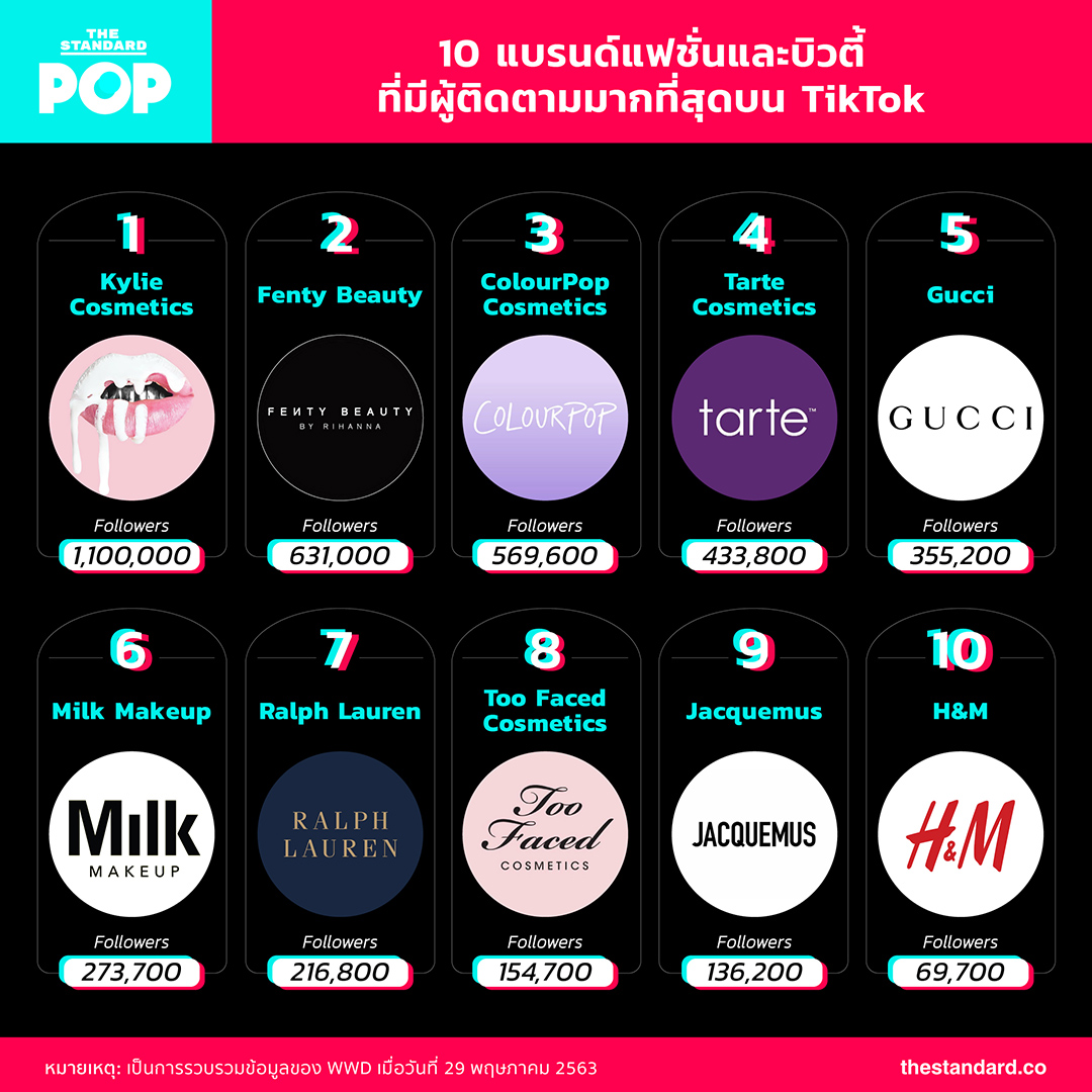 ต้องยอมรับว่าในช่วงปีนี้แอปพลิเคชัน TikTok ได้รับความนิยมอย่างก้าวกระโดดจากสารพัดชาเลนจ์โชว์สเตปและวิดีโอขนาดสั้น เหล่าแบรนด์แฟชั่นและบิวตี้จึงหันมาลงสนามแพลตฟอร์มโซเชียลมีเดียน้องใหม่นี้ที่สามารถเข้าถึงลูกค้าได้มากขึ้น โดยเฉพาะกลุ่มคนรุ่นใหม่ เว็บไซต์ WWD จึงรวบรวม 10 อันดับแบรนด์ที่มีผู้ติดตามมากที่สุด ซึ่งเราจะได้พบกับวิดีโอคอนเทนต์รูปแบบใหม่ๆ จากแบรนด์อย่างการรีวิวเครื่องสำอางตัวใหม่ การร่วมงานกับอินฟลูเอนเซอร์หน้าใหม่ ไปจนถึงแคมเปญเสื้อผ้าของของแบรนด์ลักชัวรี สรุปว่าแบรนด์อะไรท็อปสุด ไปดูกัน