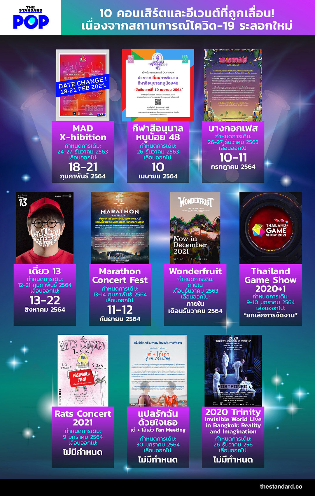 THE STANDARD POP ได้รวบรวม 10 คอนเสิร์ตและอีเวนต์ที่ถูกเลื่อนกำหนดการออกไปเนื่องจากสถานการณ์โควิด-19 ระลอกใหม่ (อีกครั้ง) และเราหวังเป็นอย่างยิ่งว่าการแพร่ระบาดในครั้งนี้จะค่อยๆ เป็นไปในทิศทางที่ดีขึ้นในเร็ววัน เพื่อให้ทุกคนสามารถกลับมาร่วมสนุกไปกับคอนเสิร์ตและอีเวนต์ที่เฝ้ารออย่างปลอดภัย