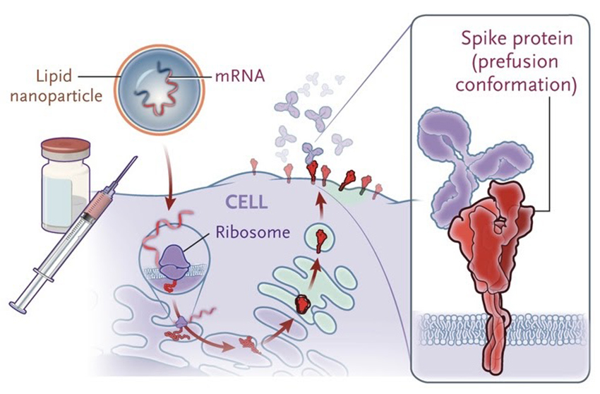 ภาพการกระตุ้นภูมิคุ้มกันของวัคซีน Pfizer (อ้างอิง: NEJM) เมื่อฉีดวัคซีนแล้ว mRNA จะเป็นแม่พิมพ์ถอดรหัสเป็นหนามของไวรัส (สีแดง) ออกไปแสดงที่ผิวเซลล์ กระตุ้นการสร้างภูมิคุ้มกัน (สีม่วง)