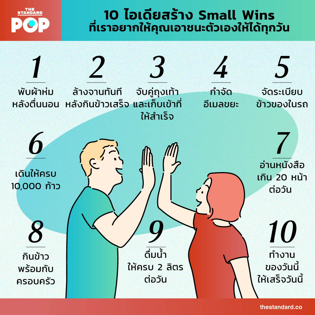 รู้หรือไม่ว่าชัยชนะเล็กๆ (Small Wins) ที่เราเอาชนะได้ในแต่ละวัน มันเป็นกุญแจลับที่จะนำพาเราไปสู่ความสำเร็จที่ยิ่งใหญ่กว่านั้นได้ ซึ่งแนวคิดนี้ได้รับความนิยมทั้งจากบทความเกี่ยวกับ The Power Of Small Wins ใน Harvard Business Review จากหนังสือเล่มดัง The Progress Principle ที่เขียนโดย Steven Kramer และ Teresa Amabile ล้วนสนับสนุนว่าการคิดแบบทำให้สำเร็จจากเรื่องเล็กๆ ให้ได้ก่อนนั้น นอกจากจะช่วยลดความกดดันมันยังช่วยสร้างแรงจูงใจที่มากขึ้น ส่วนสำคัญที่สุดคือการเอาชนะในเรื่องเล็กๆ เหล่านี้ มันคือส่วนหนึ่งของการปรับปรุงส่วนที่เราบกพร่อง และเมื่อเราเราเอาชนะมันได้ เราค่อยๆ กลายเป็นคนที่สมบูรณ์มากขึ้น ซึ่งมันได้ผลดีกวาการพยายามปรับปรุงตัวครั้งใหญ่อย่างรวดเร็ว ซึ่งมักจะล้มเหลวไม่เป็นท่า ดังนั้นวันหยุดชิลๆ แบบนี้ เราจึงอยากชวนทุกคนมาลองทำ 10 ไอเดียสร้าง Small Wins ที่เราอยากให้คุณเอาชนะตัวเองให้ได้ทุกวันดังนี้