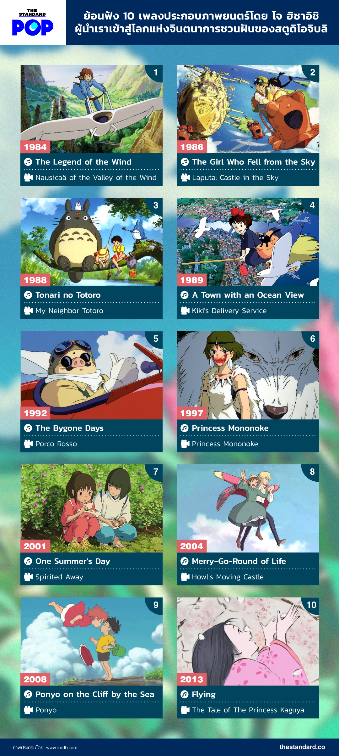 ในวาระครบรอบ 35 ปีของสตูดิโอจิบลิในครั้งนี้ THE STANDARD POP ได้จัดเพลย์ลิสต์ 10 เพลงประกอบภาพยนตร์จากปลายปากของโจ ฮิซาอิชิ เพื่อพาทุกคนกลับไปรำลึกถึงบรรยากาศ และออกเดินทางสู่โลกแห่งจินตนาการร่วมกันอีกครั้ง