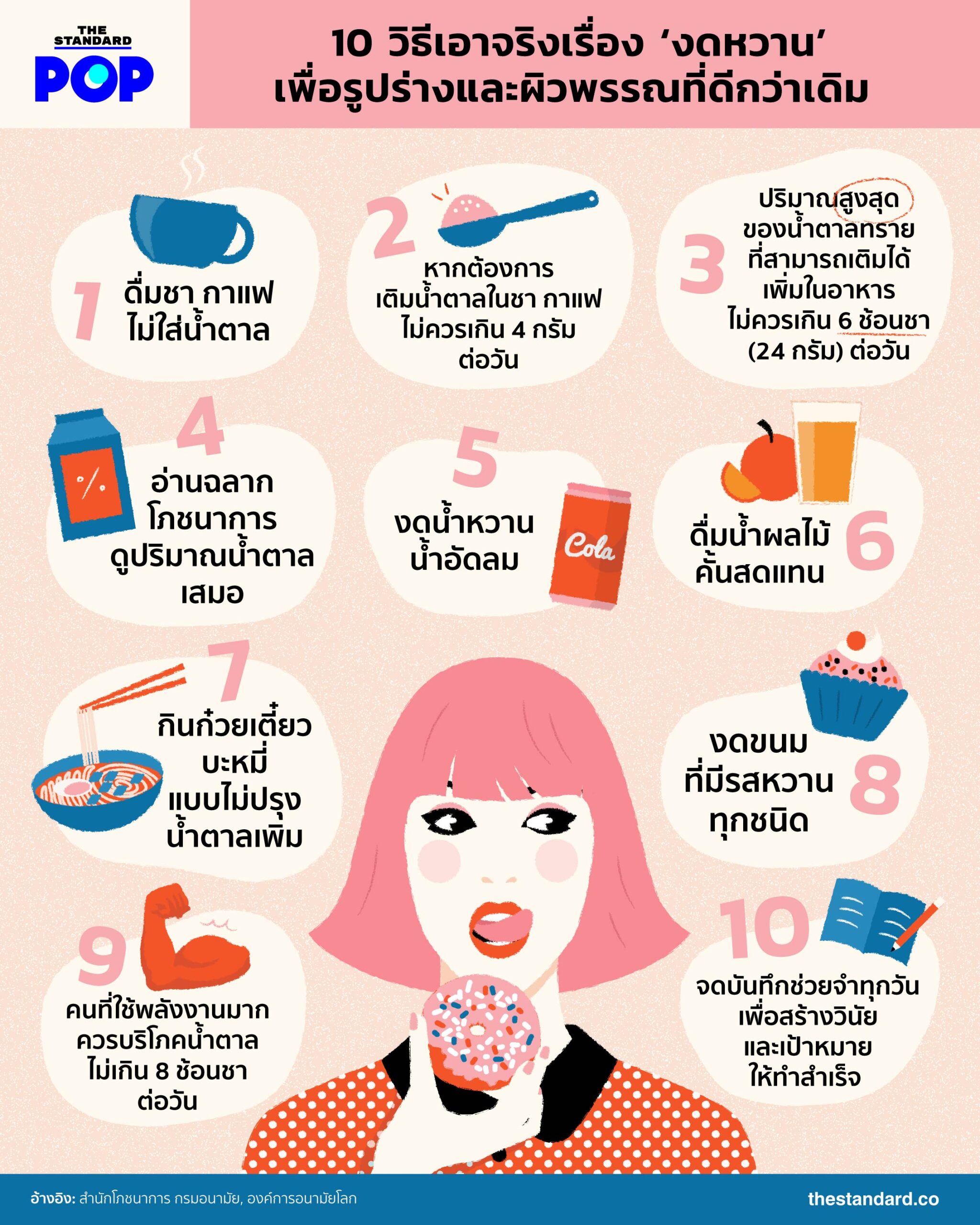 แม้น้ำตาลที่ช่วยสร้างรสหวานให้อาหารและเครื่องดื่มจะเป็นของโปรดของใครหลายคน แต่หากตามใจตัวเองในการกินหวานโดยไม่คำนึงผลท่ีจะตามมาในระยะยาว ซึ่งจะพ่วงมาด้วยโรคมากมาย เช่น โรคเบาหวาน โรคอ้วน ระบบไหลเวียนเลือดไม่ดี ผิวหนังเหี่ยวย่นและมีริ้วรอย กระดูกและฟันไม่แข็งแรง และมีผลทำให้เซื่องซึม จะเห็นชัดเลยว่าการแลกความอร่อยตามใจปากกับโรคสารพัดนั้นไม่คุ้มค่าเอาเสียเลย ดังนั้นเรามาเรียนรู้วิธีงดหวานแบบเอาจริงเพื่อสร้างสุขภาพที่ดีอย่างยั่งยืน แถมยังส่งผลดีต่อรูปร่างและผิวพรรณให้ดีกว่าเดิมด้วย แต่กรณีของผู้ที่เป็นโรคเบาหวาน แม้ว่าไม่ควรกินน้ำตาลมากเพื่อควบคุมไม่ให้ระดับน้ำตาลในเลือดขึ้นสูง แต่ควรจะต้องกินน้ำตาลบ้างในปริมาณที่พอเหมาะเพื่อควบคุมระดับน้ำตาลไม่ให้ต่ำลง