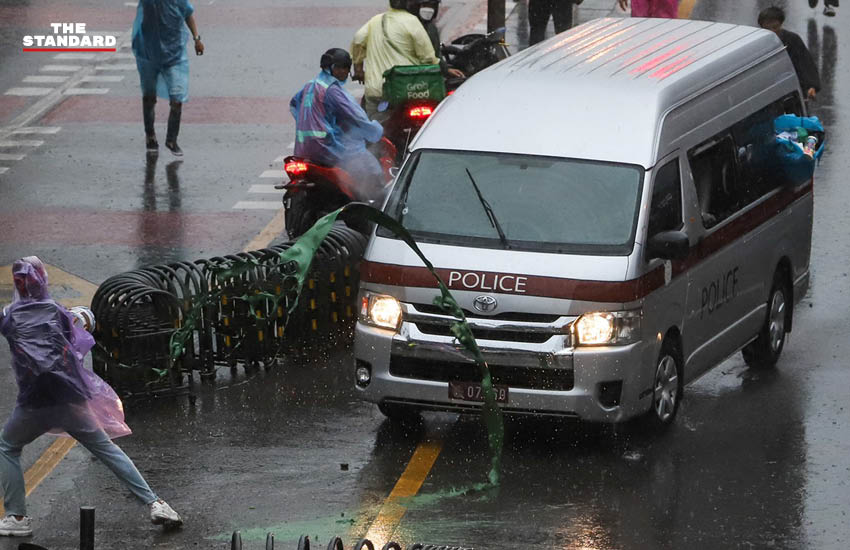 ต่อมามีผู้ชุมนุมบางส่วนที่ยังอยู่ในพื้นที่ ได้มุ่งหน้าไปยังบริเวณแยกสามเหลี่ยมดินแดง เจ้าหน้าที่ตั้งสิ่งกีดขวางสกัดกั้นผู้ชุมนุม ก่อนที่เจ้าหน้าที่จะถอนกำลังมุ่งหน้าไปยังถนนวิภาวดีรังสิต ทำให้ผู้ชุมนุมเข้ารื้อสิ่งกีดขวาง กระทั่งมีฝนตกลงมาอย่างหนัก ขณะที่ช่วงหนึ่งจุดที่ผู้ชุมนุมปักหลักอยู่มีรถตู้ของเจ้าหน้าที่ตำรวจวิ่งเข้ามา และมีผู้ชุมนุมสาดสีใส่รถ ก่อนที่รถตู้เจ้าหน้าที่จะพยายามขับรถฝ่าออกมา โดยขณะนี้ยังคงมีการเผชิญหน้าของเจ้าหน้าที่ตำรวจและผู้ชุมนุมเป็นระยะ