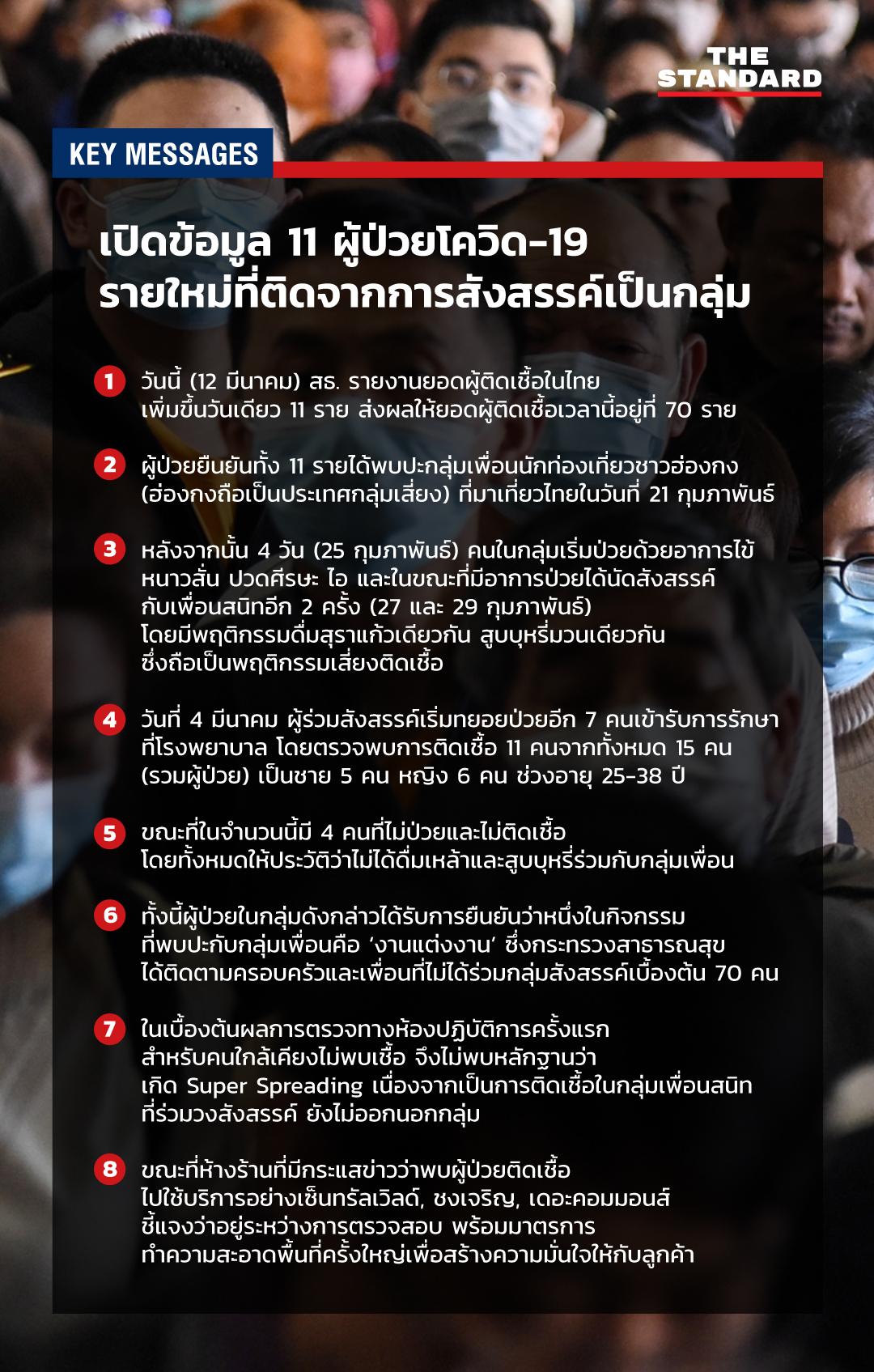 1.วันนี้ (12 มีนาคม) สธ. รายงานยอดผู้ติดเชื้อในไทยเพิ่มขึ้นวันเดียว 11 ราย ส่งผลให้ยอดผู้ติดเชื้อเวลานี้อยู่ที่ 70 ราย