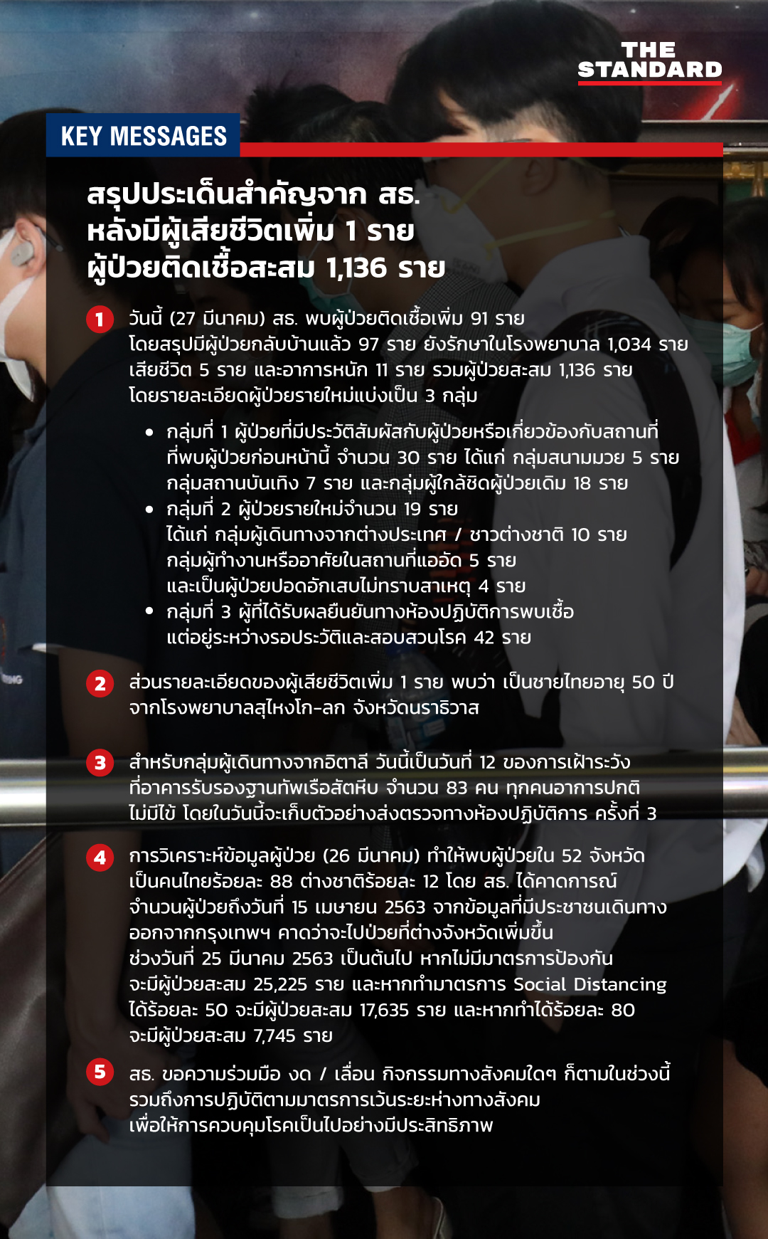 สถานการณ์การแพร่ระบาดของโควิด-19 ยังส่งผลให้ยอดผู้ติดเชื้อทั่วโลกเพิ่มขึ้นต่อเนื่อง รวมถึงประเทศไทย ที่ล่าสุดพบผู้ติดเชื้อเพิ่ม 91 ราย ทำให้ตอนนี้มีผู้ป่วยยืนยันที่รักษาหายแล้ว 97 ราย ยังรักษาตัวอยู่ในโรงพยาบาล 1,034 ราย แยกเป็นอาการหนัก 11 ราย เสียชีวิต 5 ราย รวมผู้ป่วยสะสมทั้งหมด 1,136 ราย