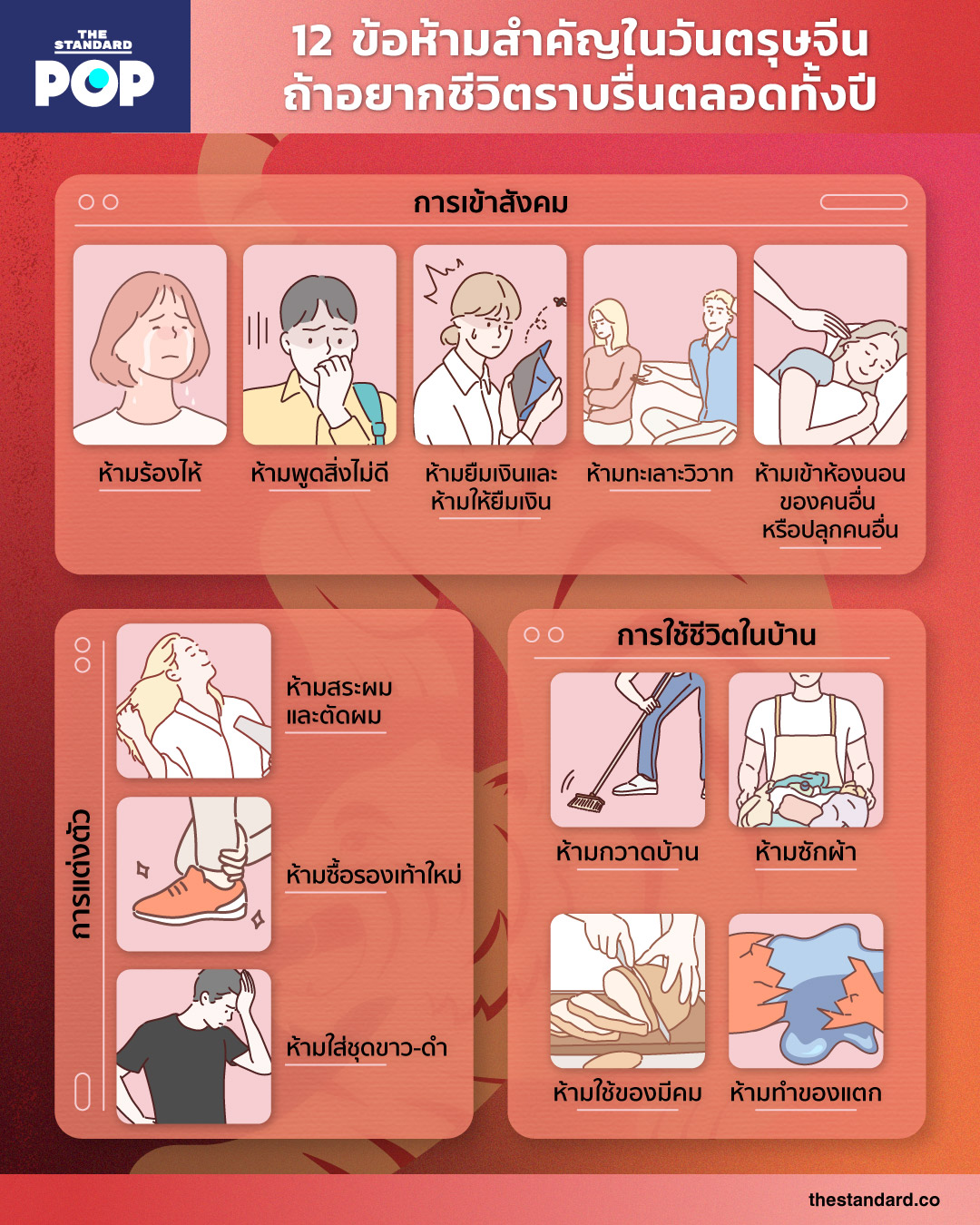 เมื่อถึงเทศกาลตรุษจีน เทศกาลแห่งความมงคล นอกจากการรวมตัวกันในครอบครัวไหว้เจ้าและไหว้บรรพบุรุษแล้ว เทศกาลตรุษจีนยังมีข้อห้ามสำคัญทางความเชื่ออยู่หลายข้อเพื่อชีวิตที่ราบรื่นตลอดทั้งปี เราได้รวบรวมข้อห้ามในวันตรุษจีนมาให้ พร้อมแบ่งเป็นหมวดหมู่ ทั้งการเข้าสังคม การแต่งตัว และการใช้ชีวิตในบ้าน ว่ามีเรื่องอะไรที่ต้องระวังไม่ให้เผลอไปทำบ้าง