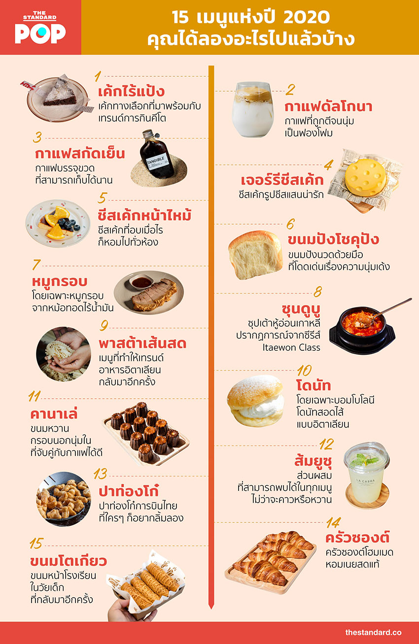ในปีที่ผ่านมา มีเมนูอาหารมากมายที่เข้ามาอยู่ในเทรนด์และจากไป บางอย่างก็ยังอยู่ในใจ แต่บางอย่างก็ถูกลืมเลือนไป ในโอกาสวันสิ้นปี 2020 เราอยากชวนคุณมานึกทบทวนไปถึงเทรนด์อาหารที่เคยมีมาตลอดทั้งปี 2020 แล้วมานับคะแนนกันสนุกๆ ว่าคุณเคยลองอะไรไปแล้วบ้าง นับแล้วอย่าลืมบอกเราด้วยนะว่าคะแนนเต็ม 15 คุณได้กี่คะแนน