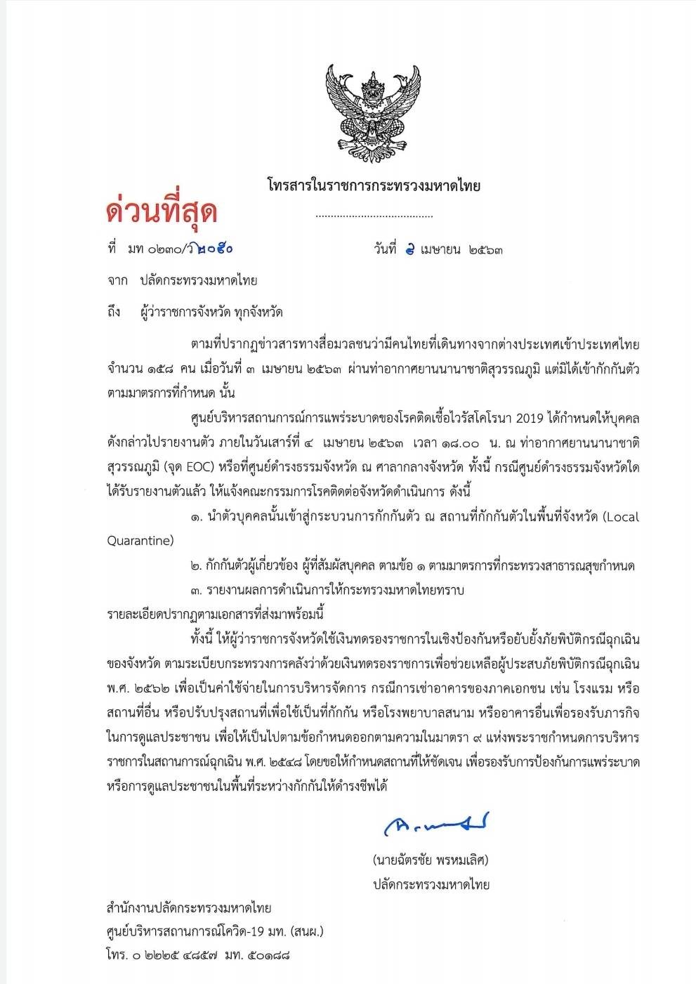 วันนี้ (4 เมษายน) ฉัตรชัย พรหมเลิศ ปลัดกระทรวงมหาดไทย (มท.) ทำหนังสือด่วนที่สุดถึงผู้ว่าราชการจังหวัดทั่วประเทศ โดยมีเนื้อหากล่าวถึงกรณีที่ปรากฏข่าวสารทางสื่อมวลชนว่า มีคนไทยที่เดินทางจากต่างประเทศเข้าประเทศไทยจำนวน 158 คน เมื่อวันที่ 3 เมษายน 2563 ผ่านท่าอากาศยานนานาชาติสุวรรณภูมิ แต่มิได้เข้ากักกันตัวตามมาตรการที่กำหนดนั้น