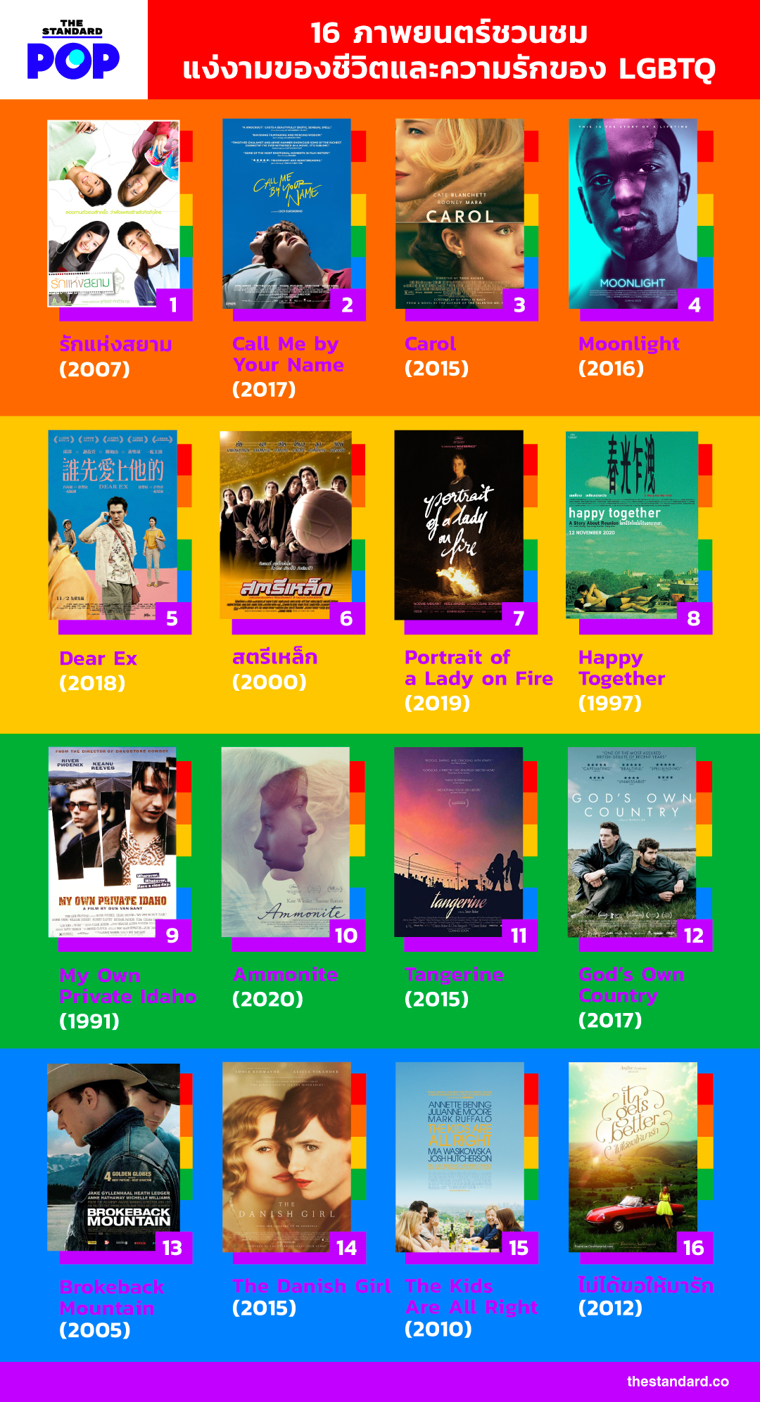 THE STANDARD POP เลือกหยิบยก 16 ภาพยนตร์ LGBTQ มาให้คุณได้เลือกสรร เพื่อเติมเต็มวันแห่งความรัก ทบทวนบทบาทของความหลากหลายทางเพศบนจอภาพยนตร์ทั้งไทยและเทศ ว่ามีอะไรน่าสนใจบ้าง หรือมีเรื่องไหนที่คุณยังไม่เคยชม เพื่อบ่งบอกว่า ไม่ว่าภาพยนตร์จะถูกเล่าด้วยตัวละครเพศไหนก็ตาม ล้วนมีแง่งาม และมีชีวิตเป็นของตัวเองเสมอ