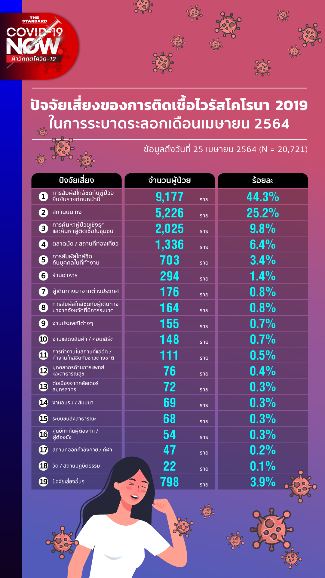 ซึ่งในการระบาดระลอกใหม่เดือนเมษายน 2564 นั้น มีข้อมูลตัวเลขเกี่ยวกับปัจจัยความเสี่ยงที่เป็นสาเหตุของการติดเชื้อที่ทางกรมควบคุมโรคได้สรุปมาให้ทั้งหมด 19 อันดับความเสี่ยง จากตัวเลขพบว่าอันดับที่ 1 ที่กินจำนวนสูงถึง 44.3% มาจาก ‘การสัมผัสใกล้ชิดกับผู้ป่วยยืนยันรายก่อนหน้านี้’ ตามด้วยอันดับ 2 อย่าง ‘สถานบันเทิง’ อยู่ที่ 25.2% และ ‘การตรวจค้นหาผู้ป่วยเชิงรุก’ อยู่ที่ 9.8% ซึ่งเป็นการตรวจพบที่มีการเชื่อมโยงกับเหตุการอื่นๆ