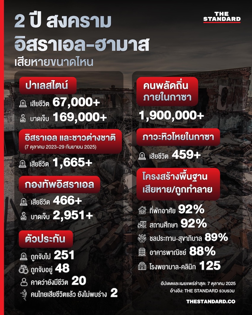 ภาพรวมความเสียหาย ครบรอบ 2 ปี สงครามอิสราเอล-ฮามาส นับตั้งแต่กลุ่มฮามาสเปิดฉากโจมตีอิสราเอลเมื่อวันที่ 7 ตุลาคม 2023 ทำให้อิสราเอลเปิดปฏิบัติการทหารโต้กลับในฉนวนกาซา เป็นเหตุให้ยอดผู้เสียชีวิตในฉนวนกาซาพุ่งสูงกว่า 67,000 คนแล้ว บาดเจ็บอย่างน้อย 169,000 คน ขณะที่มีผู้เสียชีวิตชาวอิสราเอลและชาวต่างชาติในช่วงวันที่ 7 ตุลาคม 2023-29 กันยายน 2025 อย่างน้อย 1,665 คน