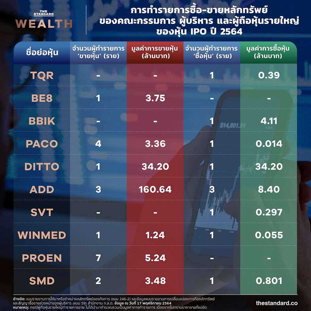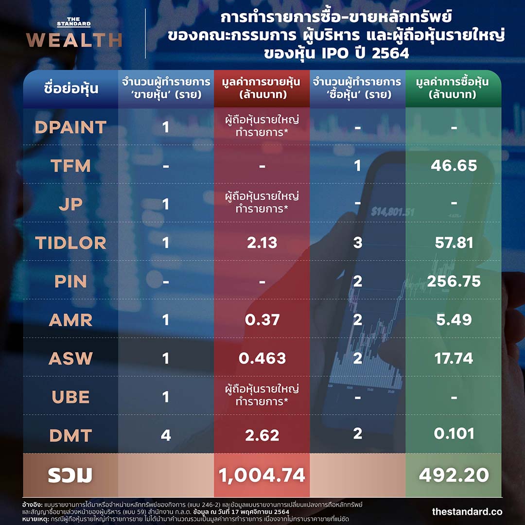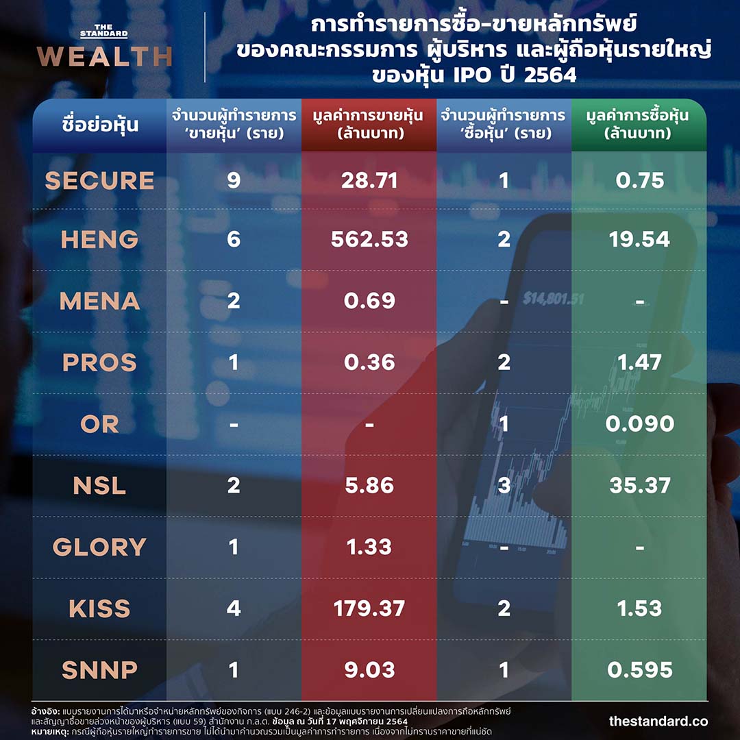 THE STANDARD WEALTH รวบรวมข้อมูลจากแบบรายงานการเปลี่ยนแปลงการถือหลักทรัพย์และสัญญาซื้อขายล่วงหน้าของผู้บริหาร (แบบ 59) และแบบรายงานการได้มาหรือจำหน่ายหลักทรัพย์ของกิจการ (แบบ 246-2) ของหุ้น IPO ที่เข้าจดทะเบียนในตลาดหลักทรัพย์และตลาดหลักทรัพย์ mai ในปี 2564 จำนวนกว่า 33 บริษัท (ข้อมูล ณ วันที่ 17 พฤศจิกายน) พบว่ามากกว่า 20 บริษัทที่กลุ่มผู้บริหาร กรรมการ และผู้ถือหุ้นรายใหญ่ ทำรายการขายหุ้นหลังจากที่เข้าจดทะเบียนในตลาดหลักทรัพย์ แต่ขณะเดียวกันก็มีผู้บริหารและกรรมการที่ทำรายการซื้อหุ้นเข้ามาเพิ่มเช่นเดียวกัน