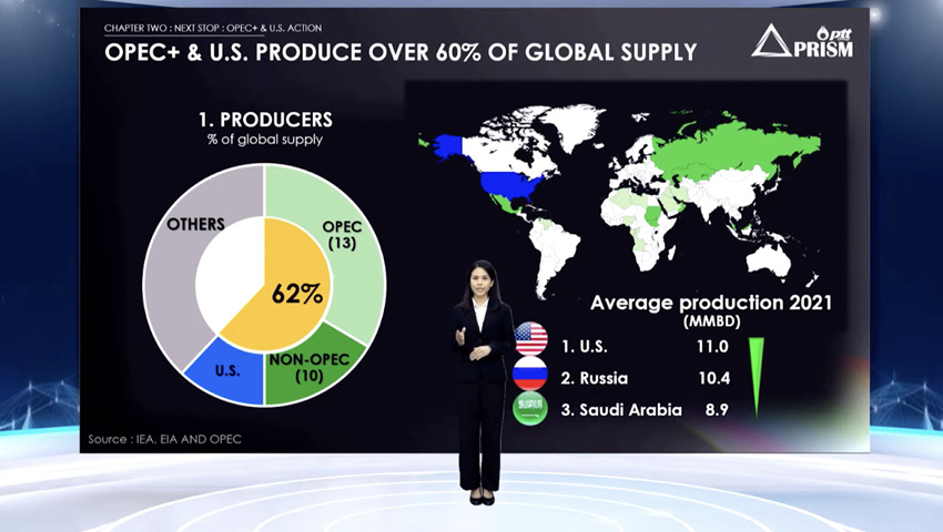 ผู้ผลิตกลุ่ม OPEC+ มีปริมาณการผลิตที่สูงที่สุดของโลกคือราว 50% ของ Global Supply ในขณะที่สหรัฐอเมริกาซึ่งอยู่นอกกลุ่ม OPEC+ ก็มีกำลังการผลิตอยู่ที่ 12% รวมกันแล้วเป็น 62% ซึ่งถือเป็นเปอร์เซ็นต์ที่สูงมากๆ ดังนั้นทั้ง OPEC+ และสหรัฐอเมริกาจึงมีบทบาทสำคัญมากในฝั่งของผู้ผลิต