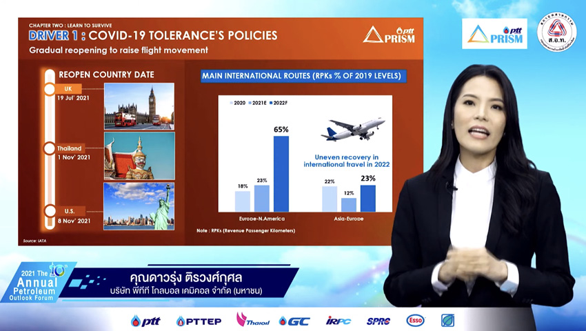 อีกหนึ่งปัจจัยที่น่าสนใจคือความต้องการน้ำมันจากการเดินทาง โดยเฉพาะการเดินทางทางอากาศ จะเห็นได้ว่าสถานการณ์การเดินทางหลังช่วงโควิด-19 นั้นเริ่มกลับเข้าสู่สภาวะปกติขึ้นเรื่อยๆ แล้ว แต่ถ้ามองในภาพใหญ่จะเห็นว่าการเดินทางทางอากาศระหว่างทวีปที่มีการเปิดประเทศมากอย่างฝั่งอเมริกา-ยุโรปนั้น น่าจะกลับมาสูงขึ้นที่อัตรา 65% ของเที่ยวบินทั้งหมดในปี 2022 แต่สำหรับฝั่งเอเชีย-ยุโรปนั้น คาดการณ์ไว้ว่าน่าจะกลับมาเพียงแค่ 23% เท่านั้น ด้วยเหตุผลสถานการณ์โควิด-19 ทางฝั่งเอเชียยังถือว่าไม่กลับมาอยู่ในอัตราที่ดีมากนัก