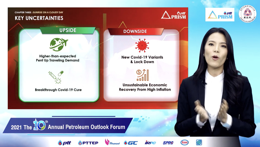 แต่ก็ต้องระวังปัจจัยไม่แน่นอนที่จะทำให้เกิดทั้ง Upside – การเพิ่มขึ้นอีกของการเดินทางและการขนส่ง การวิจัยและค้นพบยารักษาโควิด-19 และ Downside – การระบาดของโควิด-19 ระลอกใหม่ๆ การฟื้นตัวของเศรษฐกิจท่ามกลางอัตราเงินเฟ้อที่ไม่ยั่งยืน