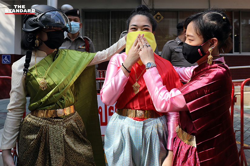 ด้าน คุ้มเกล้า ส่งสมบูรณ์ ทนายความจากศูนย์ทนายความเพื่อสิทธิมนุษยชน เปิดเผยว่า กรณีนี้ทราบว่ามีผู้สนับสนุนรัฐบาลมาแจ้งความดำเนินคดีในข้อหามาตรา 112 ไว้ว่าเยาวชนรายนี้แต่งกายในชุดครอปท็อป และจตุพรแต่งกายในชุดไทย วันนี้ผู้ต้องหาตามหมายเรียกจึงมาพบพนักงานสอบสวนเพื่อรับทราบข้อกล่าวหา ซึ่งเป็นหมายแรกของทั้งสองคน แต่กรณีของเยาวชนจะต่างจากคดีของผู้บรรลุนิติภาวะแล้ว โดยพนักงานสอบสวนจะนำตัวเยาวชนส่งศาลเยาวชนและครอบครัวกลางเพื่อพิจารณาการปล่อยตัว ซึ่งพนักงานสอบสวนยืนยันจะปล่อยตัวกลับบ้านเหมือนผู้ต้องหาคดีเดียวกันในพื้นที่อื่น โดยบรรยากาศหน้าโรงพักมีมวลชนจำนวนหนึ่งแต่งกายด้วยชุดไทยมาให้กำลังใจ