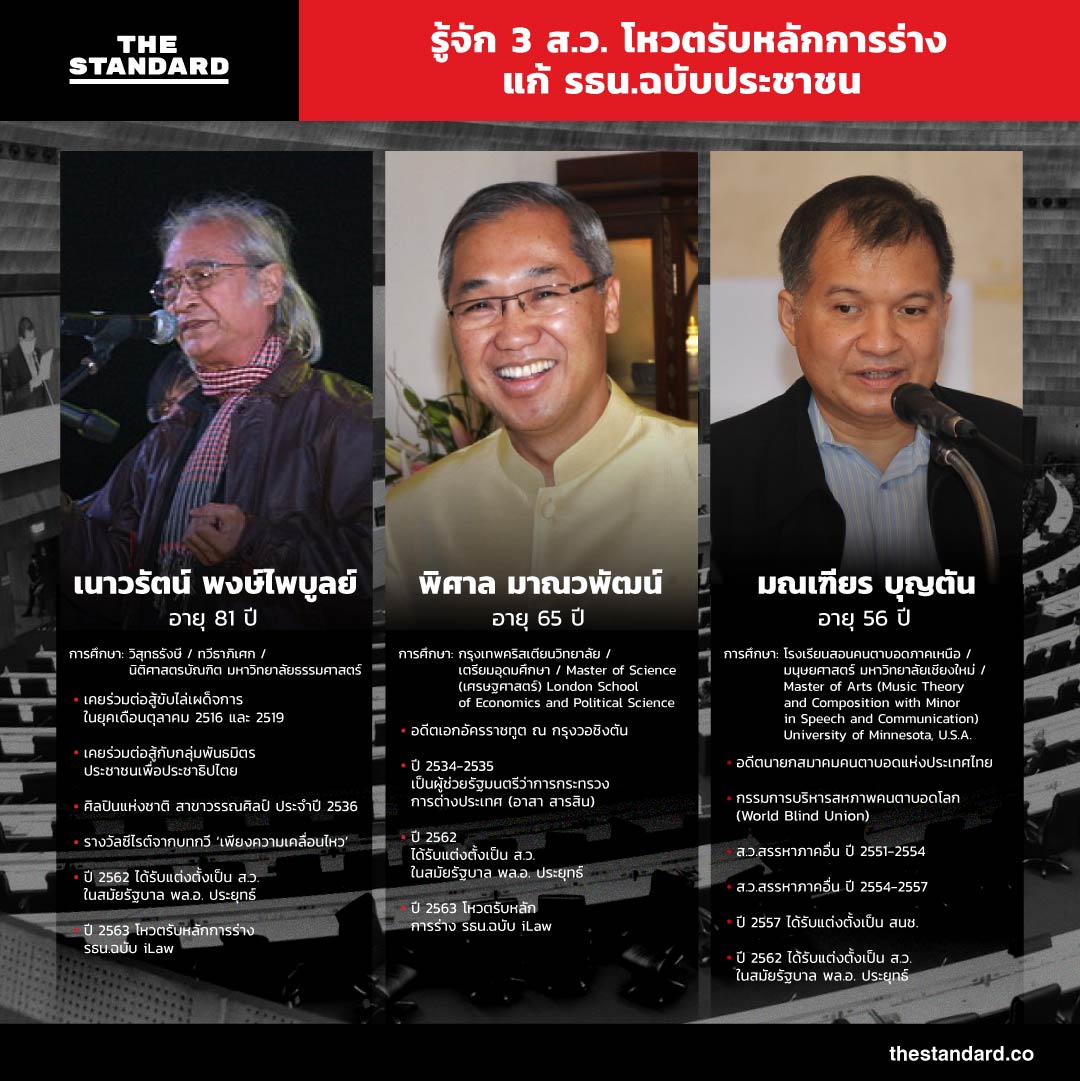 ทั้งนี้ สำหรับรายชื่อ ส.ว. ที่โหวตรับหลักการร่างแก้ไขรัฐธรรมนูญ ได้แก่ เนาวรัตน์ พงษ์ไพบูลย์, พิศาล มาณวพัฒน์ และ มณเฑียร บุญตัน