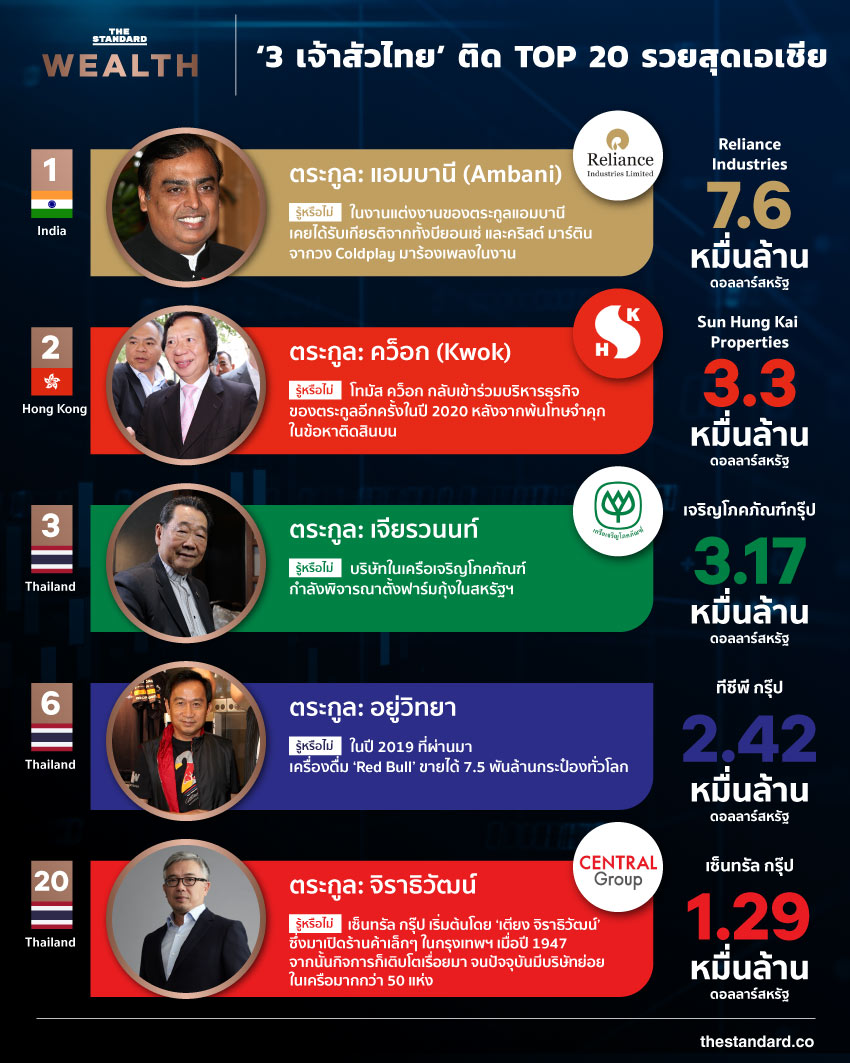 Bloomberg สำรวจ ‘20 ตระกูลร่ำรวยสุดในเอเชีย’ ซึ่งครองความมั่งคั่งรวมกว่า 4.63 แสนล้านดอลลาร์สหรัฐ หรือประมาณ 14.35 ล้านล้านบาท โดยมี 3 ตระกูลมหาเศรษฐีไทยติดอันดับ คือ ตระกูลเจียรวนนท์ มั่งคั่งเป็นอันดับที่ 3 ในเอเชีย ครองสินทรัพย์ 3.17 หมื่นล้านดอลลาร์ หรือประมาณ 9.82 แสนล้านบาท, ตระกูลอยู่วิทยา ติดอันดับที่ 6 ด้วยมูลค่าความมั่งคั่ง 2.42 หมื่นล้านดอลลาร์ หรือประมาณ 7.5 แสนล้านบาท และตระกูลจิราธิวัฒน์ ติดอันดับที่ 20 ครองความมั่งคั่ง 1.29 หมื่นล้านดอลลาร์ หรือประมาณ 3.99 แสนล้านบาท