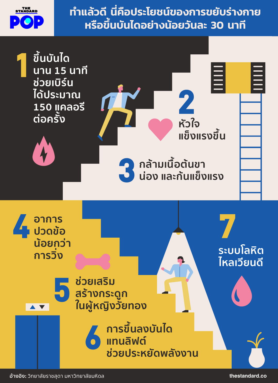 รู้หรือไม่ว่าเรื่องเล็กๆ น้อยๆ ในชีวิตประจำวัน เช่น การขยับร่างกาย ทำงานบ้าน เดิน หรือขึ้นบันไดให้ได้อย่างน้อยวันละ 30 นาทีนั้นมีประโยชน์ต่อร่างกายมหาศาล ข้อเท็จจริงนี้เปิดเผยโดยคณะกรรมการจัดการพลังงาน วิทยาลัยราชสุดา มหาวิทยาลัยมหิดล ที่ต้องการให้ประชาชนเห็นความสำคัญของการออกกำลังกาย โดยเฉพาะการขึ้นลงบันไดนั้นสามารถทำได้ง่ายๆ และเป็นผลดีต่อสุขภาพมาก ต่อไปนี้คือข้อดีของการขยับร่างกายหรือขึ้นลงบันไดทุกวัน