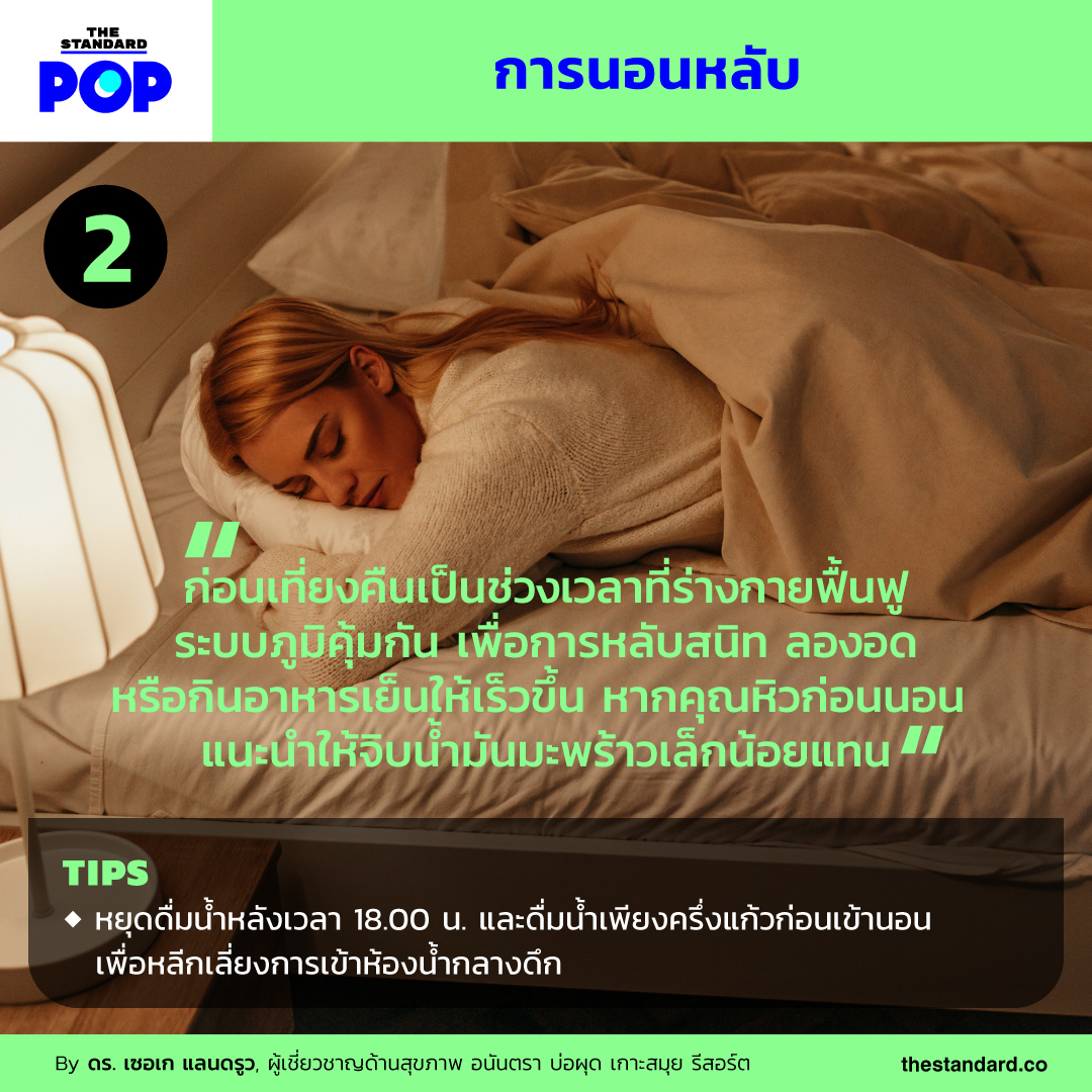 การนอนอย่างมีคุณภาพจะช่วยให้ร่างกายซ่อมแซมและฟื้นฟูได้อย่างสมบูรณ์ ซึ่งหนึ่งในวิธีที่ช่วยให้คุณหลับอย่างเต็มอิ่มคือการทำ Intermittent Fasting (IF) หรืออดอาหารเป็นระยะ แนะนำให้กินมื้อเช้า กลางวัน หรือเย็นเร็วขึ้นหน่อย อย่ากินอาหารก่อนนอน ในกรณีที่คุณหิวจนทนไม่ไหวอาจจิบน้ำมันเล็กน้อยแทน ซึ่งอาจเป็นน้ำมันมะพร้าว น้ำมันมะกอก น้ำมันงา หรือน้ำมันอื่นๆ ที่ดีต่อสุขภาพ