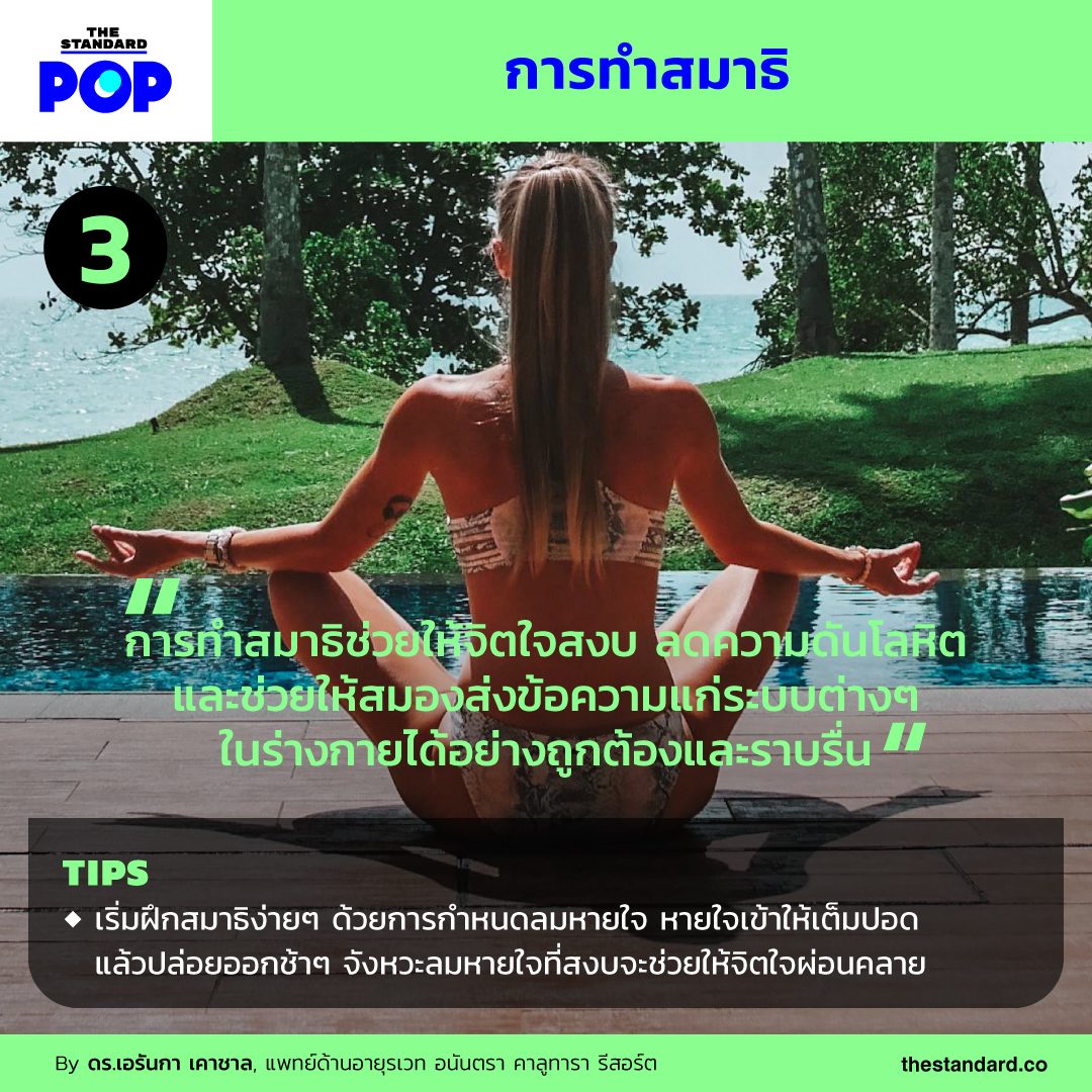 การทำสมาธิเป็นวิธีที่ช่วยให้จิตใจสงบ การรวมพลังจักระให้อยู่ตรงกลางของร่างกาย ช่วยลดความดันโลหิต เสริมสร้างระบบการทำงานของร่างกาย การฝึกสมาธิอย่างสม่ำเสมอจะช่วยให้สมองส่งข้อความที่ถูกต้องไปยังร่างกายและปฏิบัติตามได้อย่างราบรื่น แถมยังช่วยลดระดับความเครียด ซึ่งมีผลให้ระบบภูมิคุ้มกันทำงานได้ดีขึ้น