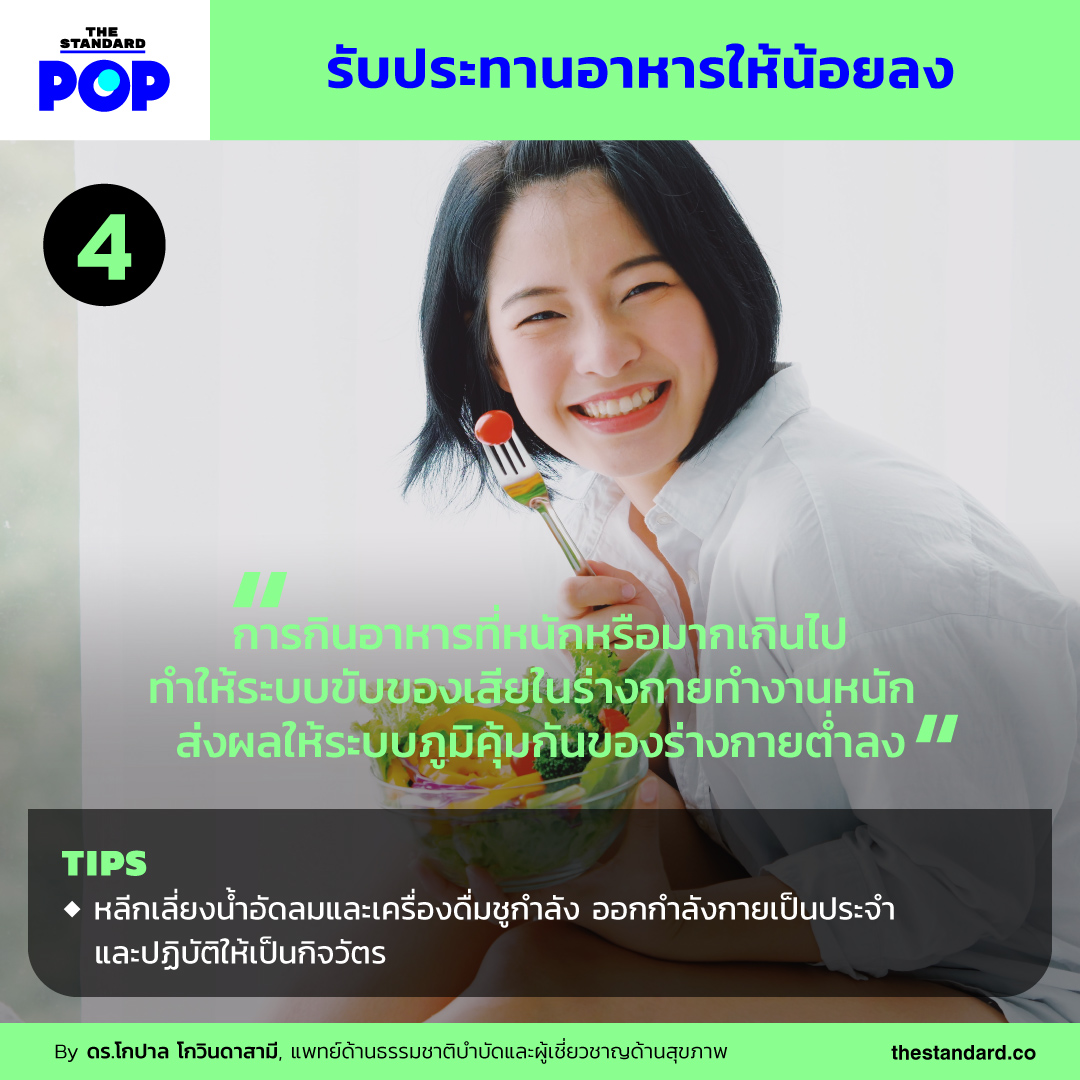 การกินอาหารที่หนักหรือมากเกินไปจะทำให้ระบบขับของเสียในร่างกายทำงานหนักเกินไป และส่งผลให้ระบบภูมิคุ้มกันของร่างกายต่ำลง