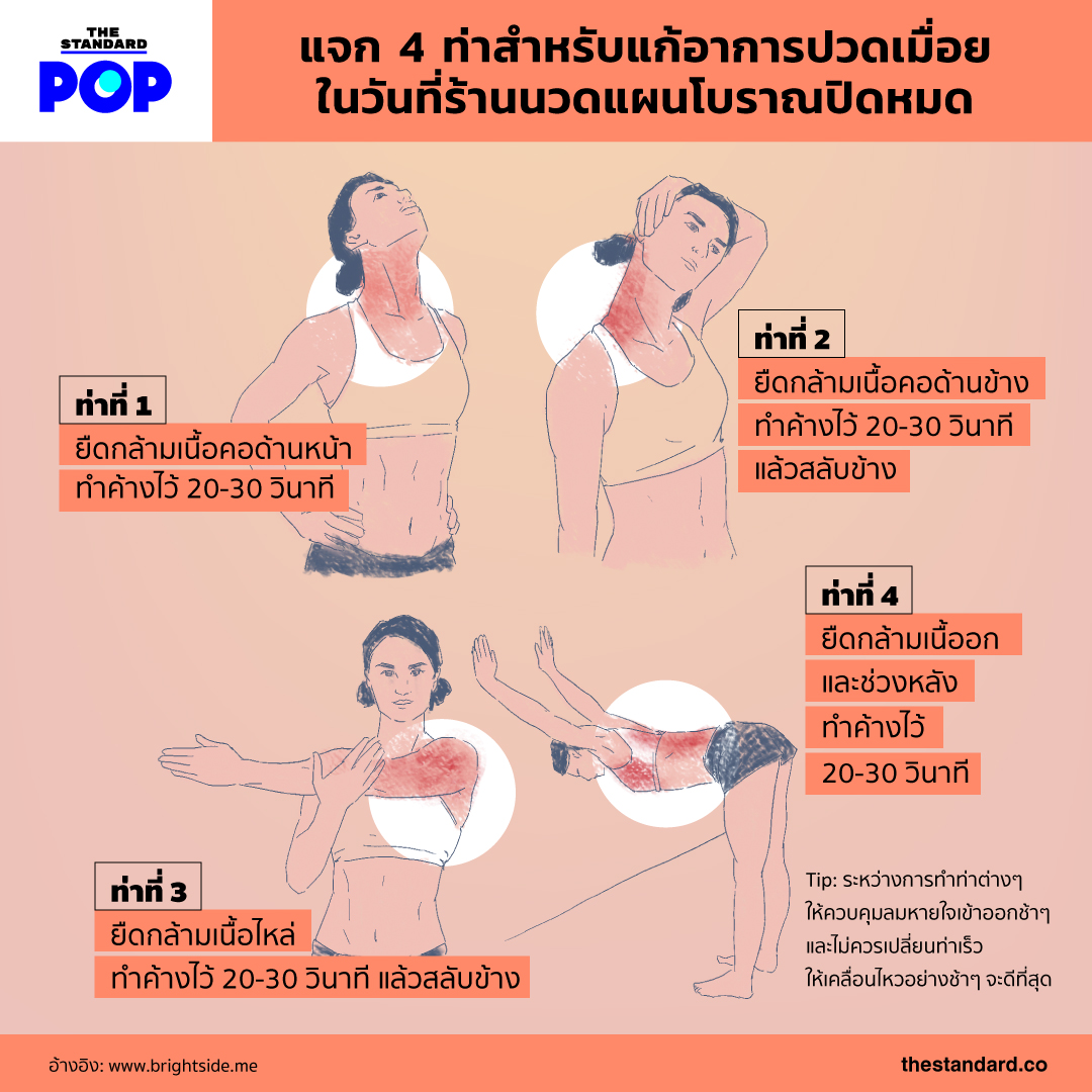 ทำอย่างไรดี เมื่อขาก็ตึง หลังก็ปวด บ่าไหลก็เมื่อย สถานที่พึ่งพายามยากของร่างกายอย่างร้านนวดแผนโบราณก็พากันปิดชั่วคราวตามประกาศของกระทรวงสาธารณสุขเพื่อป้องกันการแพร่กระจายของโรคโควิด-19 ในสถานการณ์แบบนี้ THE STANDARD POP จึงคัด 4 ท่าสำหรับยืดกล้ามเนื้อแก้อาการปวดเมื่อยที่ทุกคนสามารถทำตามได้ไม่ยาก ไปดูกันเลย