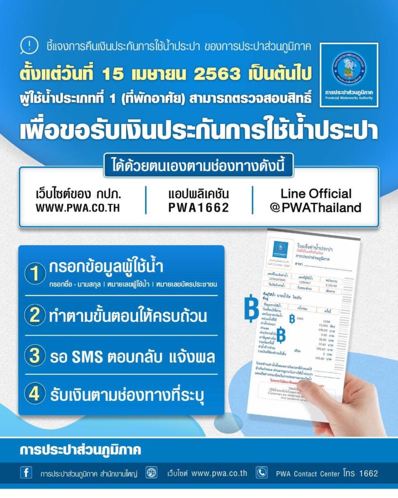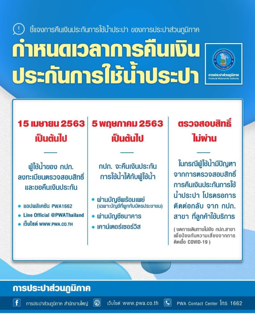 ทั้งนี้จะสามารถขอเงินประกันคืนได้ตั้งแต่ 15 เมษายน และจะเริ่มคืนเงินประกัน 5 พฤษภาคม ผ่านบัญชีพร้อมเพย์ บัญชีธนาคาร และเคาน์เตอร์เซอร์วิส หากตรวจสอบสิทธิ์ไม่ผ่าน ให้รอการติดต่อกลับจาก กปภ. สาขาที่ใช้บริการ