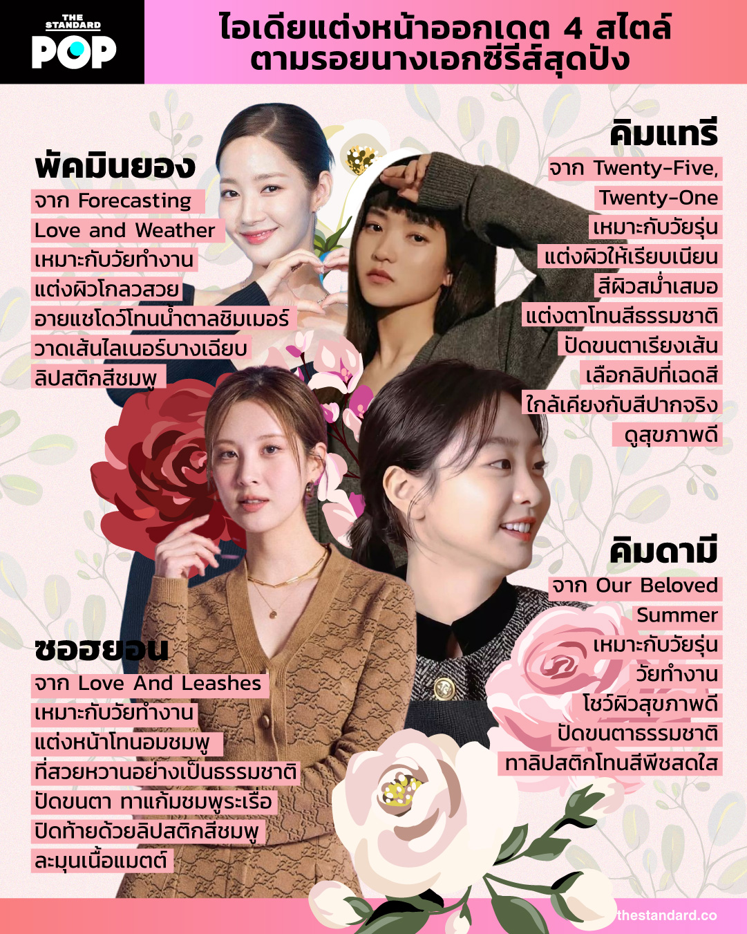 การแต่งหน้าออกเดตที่ดีที่สุดนั้นคือการแต่งหน้าที่แต่งแล้วตัวเองรู้สึกมีความสุขและมั่นใจ เพราะความมั่นใจนี่แหละคือเสน่ห์อันทรงพลังที่จะไม่มีใครมาขโมยไปจากเราได้ เราไม่อยากให้สาวๆ ทำพลาดด้วยการแต่งหน้าเปลี่ยนลุคไปอย่างสิ้นเชิงจนจำตัวเองแทบไม่ได้ เพราะมันกลบตัวตนและปิดบังเสน่ห์ของตัวเองไปโดยไม่รู้ตัว เพียงเพราะอยากเปลี่ยนลุคที่สร้างความประทับใจมากที่สุดในแบบที่ตัวเองไม่คุ้นเคยกับสไตล์เหล่านั้น แทนที่จะมั่นใจอาจกลายเป็นประหม่าเสียเอง ดังนั้นใครที่คิดจะเปลี่ยนลุคแบบสุดโต่ง ช้าก่อน! THE STANDARD POP มีไอเดียแต่งหน้าในลุคที่สวยมีเสน่ห์อย่างเป็นธรรรมชาติในแบบฉบับของนางเอกเกาหลีมาฝาก รับรองว่าสาวไทยสามารถแต่งตามได้เพื่อดึงเสน่ห์ของตัวเองออกมา เคล็ดลับคือใช้โทนสีเครื่องสำอางที่คุ้นเคยและชื่นชอบอยู่แล้วในชีวิตประจำวันมาแต่งแต้มสีสันให้ใบหน้าดูสดชื่น มีความสุข