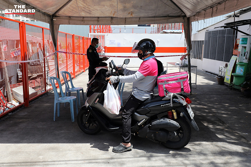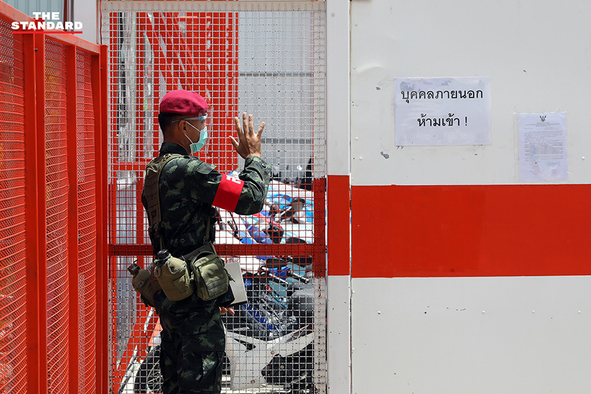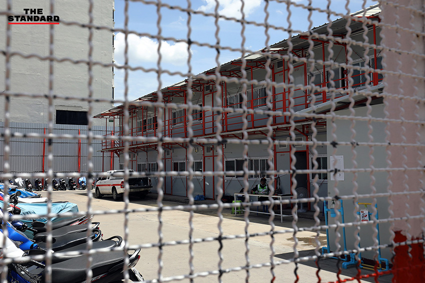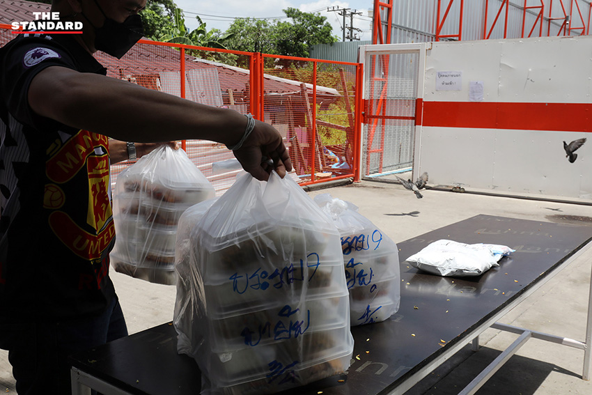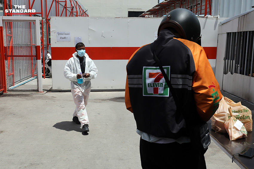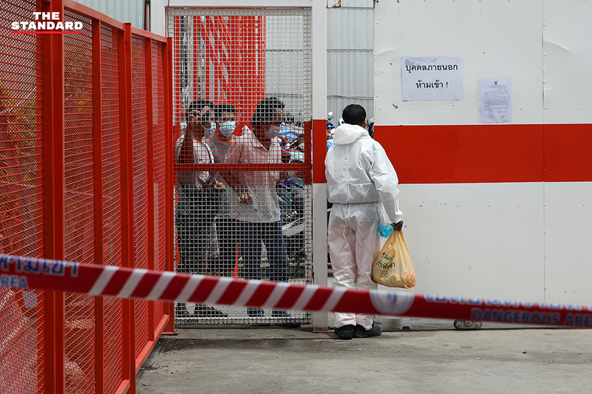 วันนี้ (29 มิถุนายน) ช่างภาพ THE STANDARD ลงพื้นที่สำรวจหน้าแคมป์ดังกล่าว พบเจ้าหน้าที่ที่อยู่เฝ้าแคมป์ โดยเจ้าหน้าที่สวมชุด PPE คอยรับ-ส่งอาหารจากทั้งขนส่งหรือฟู้ดเดลิเวอรีเจ้าต่างๆ นำไปส่งด้านในบริเวณแคมป์คนงาน ซึ่งเจ้าหน้าที่เปิดเผยว่าแคมป์นี้มีคนงานจากหลายบริษัทอาศัยอยู่ ดังนั้นบางครั้งอาหารก็จะมาเพียง 50 กล่องจริง แต่เป็นอาหารเฉพาะของคนงานบริษัทนั้นๆ แต่ละบริษัทก็จะมีการดูแลคนงานแตกต่างกันไป
