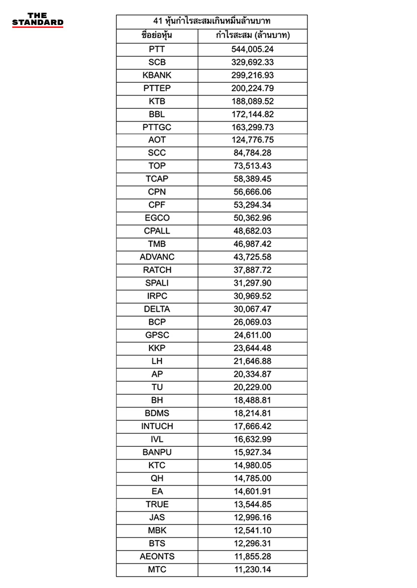 สำนักข่าวอีไฟแนนซ์ไทยสำรวจงบการเงิน บจ. ประจำปี 2562 พบว่า ปัจจุบันมี 41 บริษัท ที่มีกำไรสะสมมากกว่า 1 หมื่นล้านบาท ได้แก่
