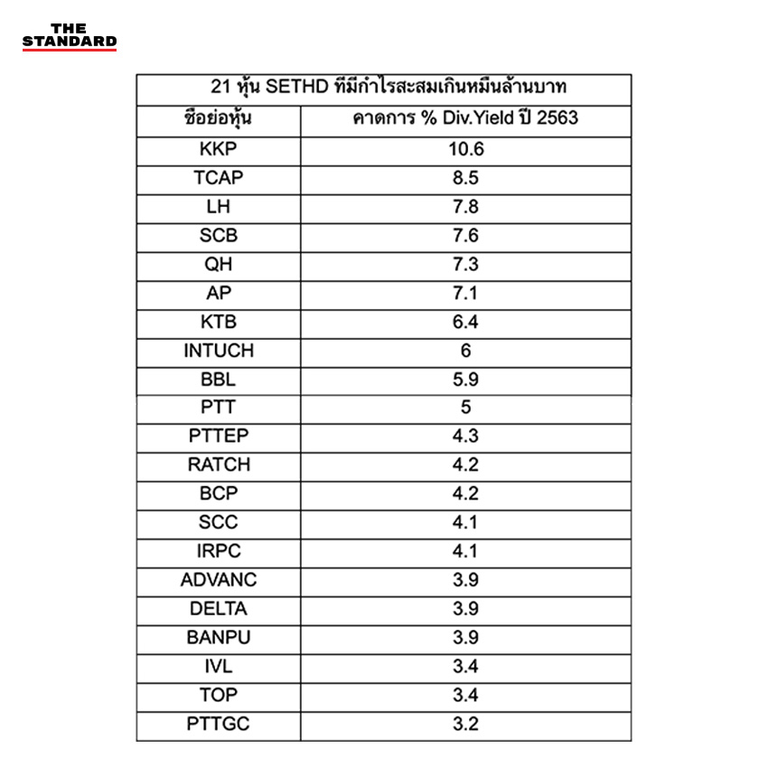 ทั้งนี้ เมื่อสำรวจข้อมูลจาก IAA Consensus ณ วันที่ 16 เมษายน 2563 พบว่า มีถึง 15 บริษัทในกลุ่มนี้ที่มีแนวโน้มอัตราการจ่ายเงินปันผลตอบแทนเฉลี่ยประจำปี 2563 มากกว่า 4% โดยธนาคารเกียรตินาคิน (KKP) ถูกคาดการณ์ Dividend Yield เฉลี่ยถึง 10.6% สูงสุด 14.3% ต่ำสุด 7.4%
