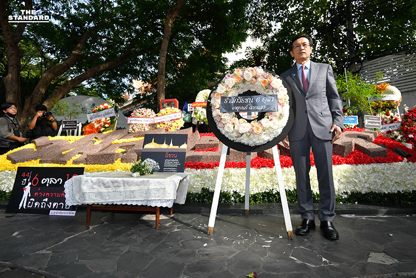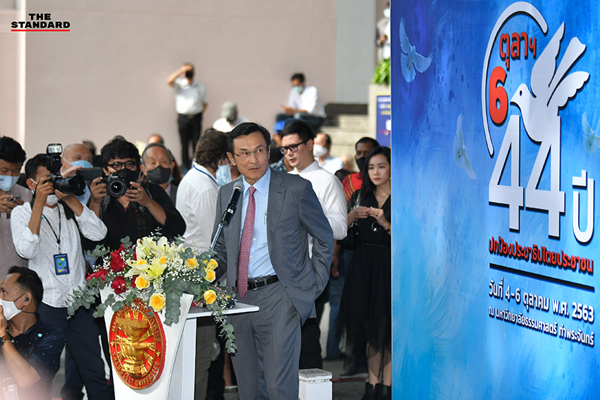วันนี้ (6 ตุลาคม) มหาวิทยาลัยธรรมศาสตร์จัดงาน ‘ครบรอบ 44 ปี 6 ตุลาฯ 2519’ ประจำปี 2563 ที่มหาวิทยาลัยธรรมศาสตร์ ท่าพระจันทร์ เพื่อร่วมกันรำลึกและเรียนรู้ประวัติศาสตร์ พร้อมทั้งไว้อาลัยวีรชนผู้สูญเสียในเหตุการณ์ประวัติศาสตร์ โดยภายในงานมีพิธีทำบุญตักบาตรพระสงฆ์ พิธีวางพวงมาลา-ดอกไม้ และยืนไว้อาลัยแด่เหล่าวีรชนผู้สูญเสีย พร้อมทั้งมอบรางวัล ‘จารุพงษ์ ทองสินธุ์ เพื่อประชาธิปไตย’ ให้กับ อานนท์ นำภา และภาณุพงศ์ จาดนอก