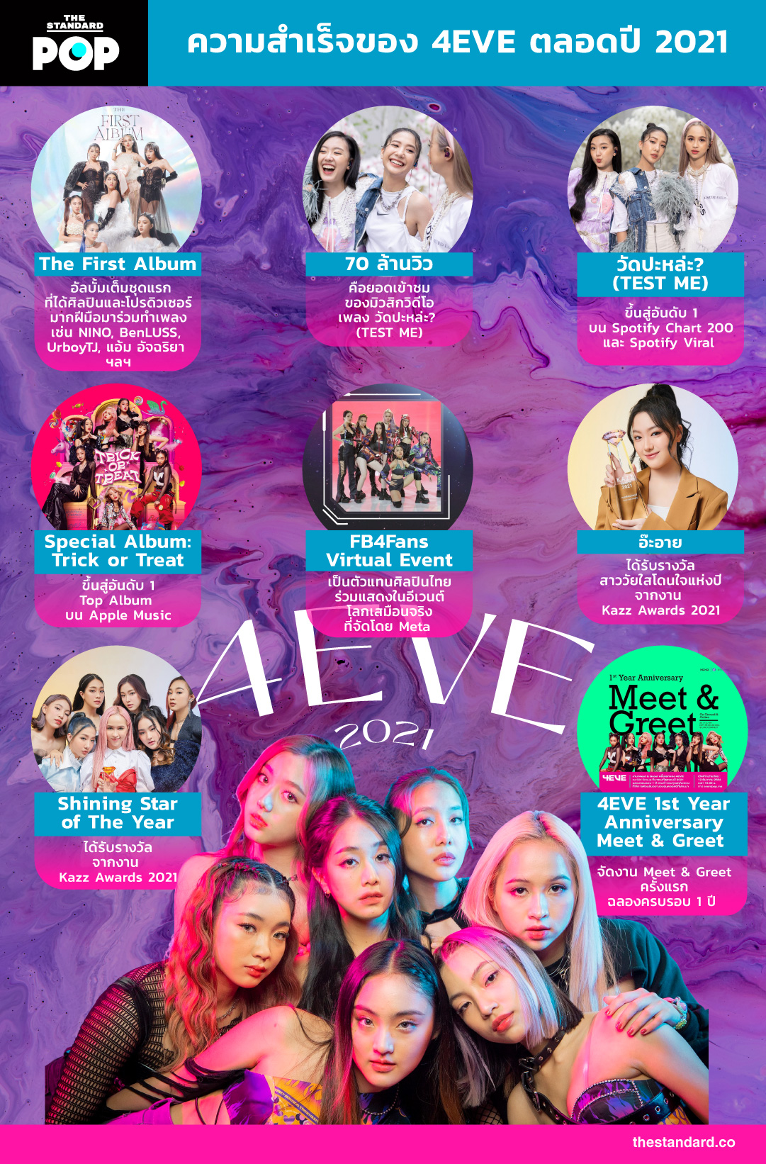 THE STANDARD POP ได้รวบรวมความสำเร็จส่วนหนึ่งของ 4EVE ตลอดปี 2021 ที่พิสูจน์ว่าพวกเธอคือหนึ่งในวงเกิร์ลกรุ๊ประดับแถวหน้าของเมืองไทย ไม่ว่าจะเป็นการปล่อยอัลบั้มเต็มชุดแรก The First Album ที่ได้ศิลปินและทีมงานมากฝีมือมาร่วมทำเพลง, Special Album: Trick or Treat ที่ฮิตถล่มทลายจนสามารถไล่ขึ้นสู่อันดับ 1 Top Album บน Apple Music, การได้รับรางวัล Shining Star of The Year จากงาน Kazz Awards 2021 ฯลฯ