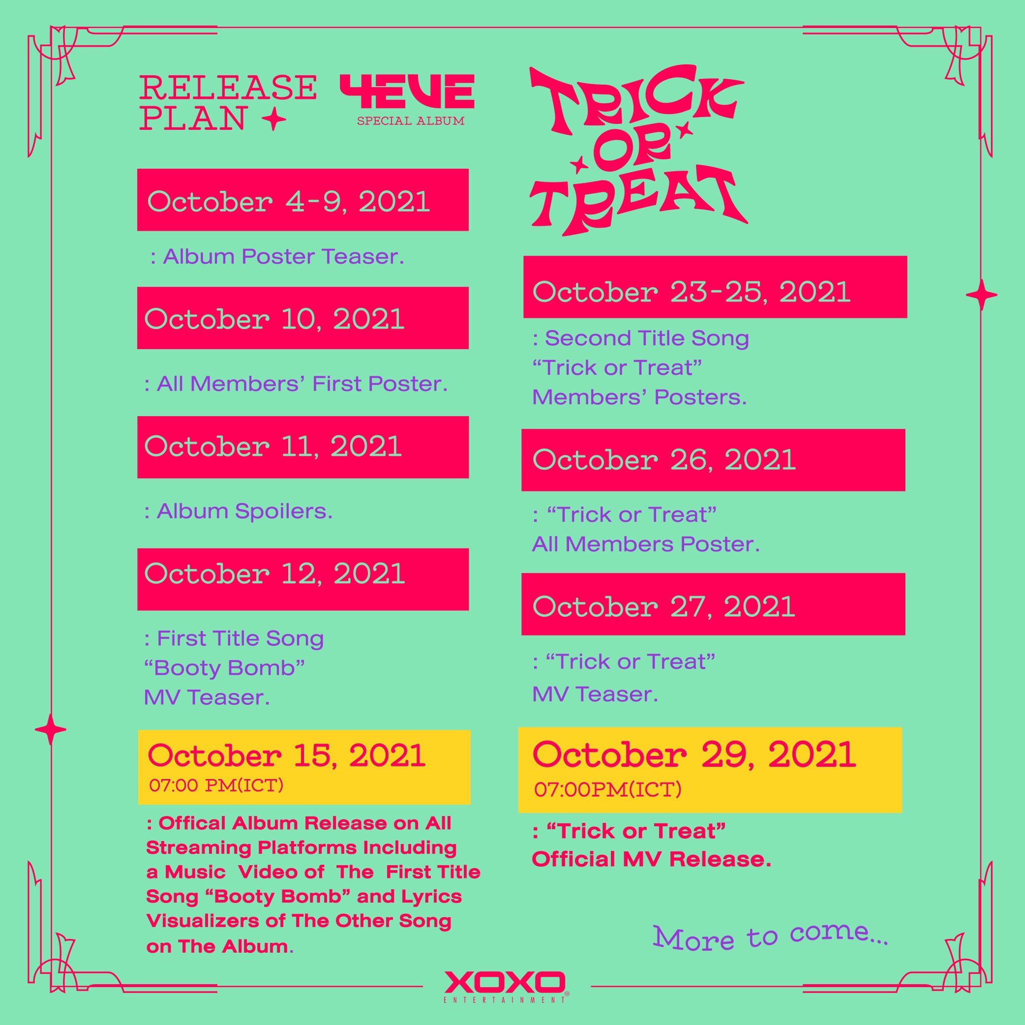 4EVE เกิร์ลกรุ๊ปมากเสน่ห์แห่งค่าย XOXO Entertainment เตรียมปล่อย Special Album ซึ่งชื่อว่า Trick or Treat ที่อัดแน่นไปด้วย 4 บทเพลงคุณภาพคับแก้ว ต้อนรับเทศกาลฮาโลวีน ให้แฟนเพลงได้ฟังพร้อมกันทุกแพลตฟอร์มสตรีมมิง พร้อมกับมิวสิกวิดีโอเพลง Booty Bomb วันที่ 15 ตุลาคมนี้ เวลา 19.00 น.