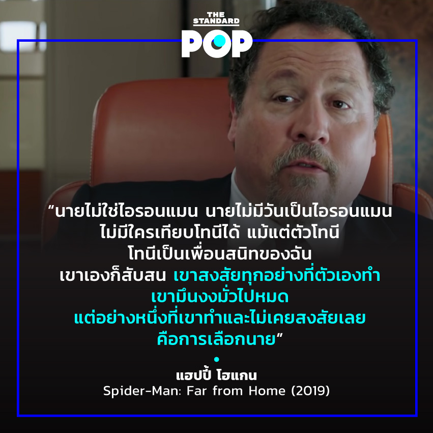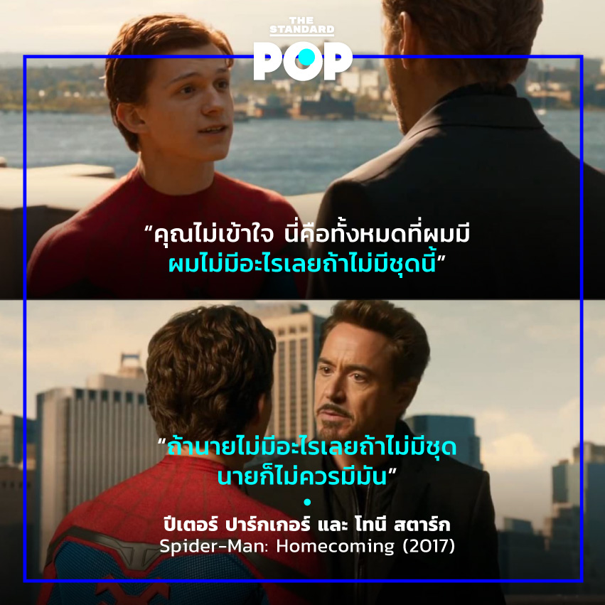 บทสนทนาสั้นๆ ที่โทนีกล่าวในฉากนี้ได้ย้ำเตือนให้ปีเตอร์ (และผู้ชม) ได้ทำความเข้าใจอย่างชัดเจนว่า ‘ฮีโร’ ไม่ได้เป็นเพียงบุคคลที่มี ‘พลังพิเศษ’ เพื่อช่วยเหลือ ‘ผู้คน’ เพียงอย่างเดียวเท่านั้น แต่มันมาพร้อมกับ ‘ความรับผิดชอบ’ และ ‘ความสูญเสีย’ ที่จะตามมา หากฮีโร่คนนั้นเลือกใช้พลังของตนเองอย่างไม่รอบคอบและทำให้การตัดสินใจผิดพลาด ซึ่งตัวโทนีที่เคยช่วยเหลือผู้คนมาแล้วมากมายและเคยทำผิดพลาดมาแล้วหลายครั้ง จึงเข้าใจรสชาติของ ‘ความสูญเสีย’ เป็นอย่างดี