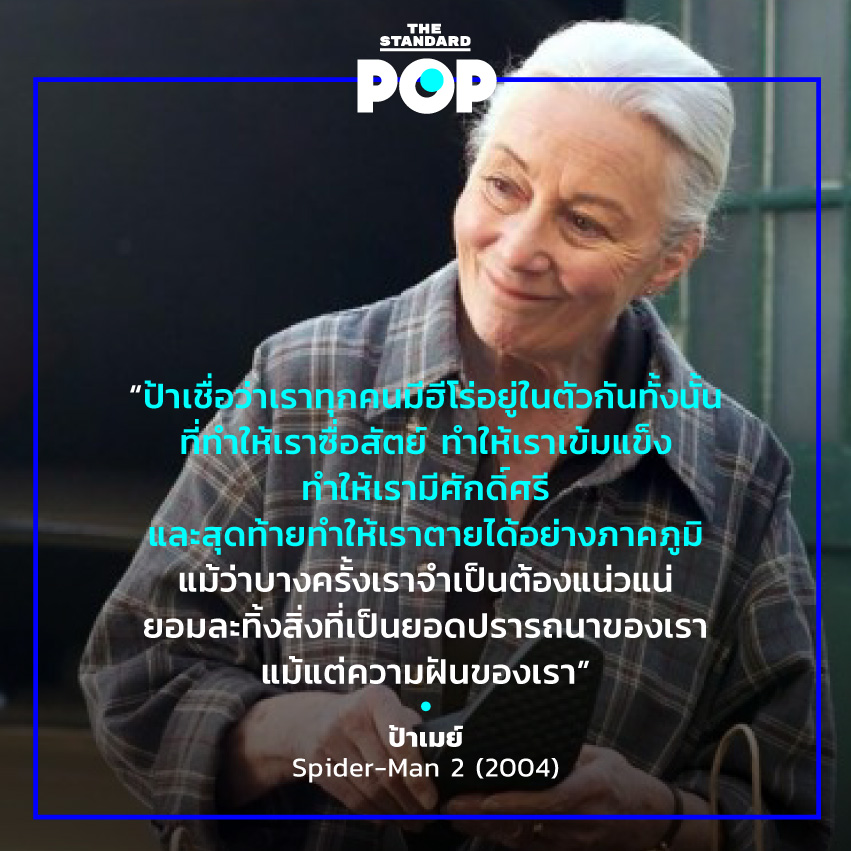 “ป้าเชื่อว่าเราทุกคนมีฮีโร่อยู่ในตัวกันทั้งนั้น ที่ทำให้เราซื่อสัตย์ ทำให้เราเข้มแข็ง ทำให้เรามีศักดิ์ศรี และสุดท้ายทำให้เราตายได้อย่างภาคภูมิ แม้ว่าบางครั้งเราจำเป็นต้องแน่วแน่ ยอมละทิ้งสิ่งที่เป็นยอดปรารถนาของเรา แม้แต่ความฝันของเรา สไปเดอร์แมนทำสิ่งนั้นเพื่อเฮนรี่ เขาถึงสงสัยว่าสไปเดอร์แมนหายไปไหน เขาต้องการสไปเดอร์แมน”