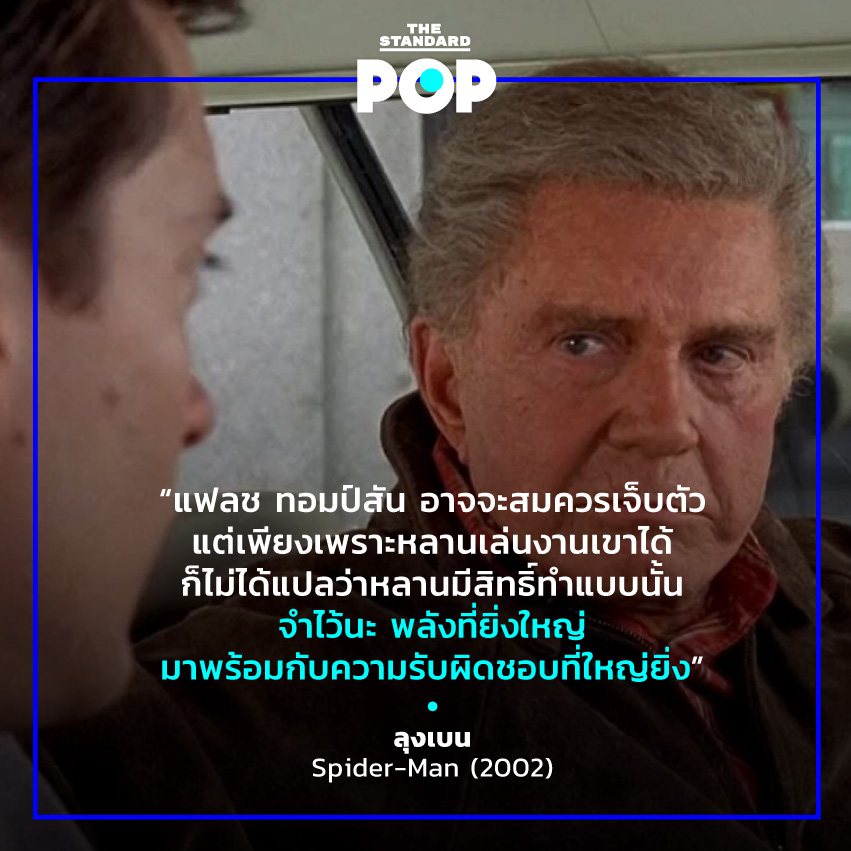 ดูเหมือนว่าประโยคข้างต้นที่ ลุงเบน (Cliff Robertson) กล่าวกับ ปีเตอร์ ปาร์กเกอร์ (Tobey Maguire) ในภาพยนตร์ Spider-Man (2002) จะเป็นประโยคที่อธิบายความหมายของการเป็น ‘ฮีโร่’ ได้อย่างครบถ้วนกระบวนความ ไม่ว่าจะเป็นการเลือกใช้พลังเหนือมนุษย์ในทางที่ถูกต้องคอยช่วยเหลือผู้คนแม้จะไม่ได้รับสิ่งใดตอบแทน และยังต้องแลกมากับชีวิตแสนธรรมดาที่เขาไม่อาจจะมีได้ ซึ่งคำพูดประโยคนี้ยังเป็นบทเรียนสำคัญที่ช่วยให้ปีเตอร์ได้ยึดมั่นในยามที่ตนเองรู้สึกไขว้เขวกับการเป็นสไปเดอร์แมนอีกด้วย