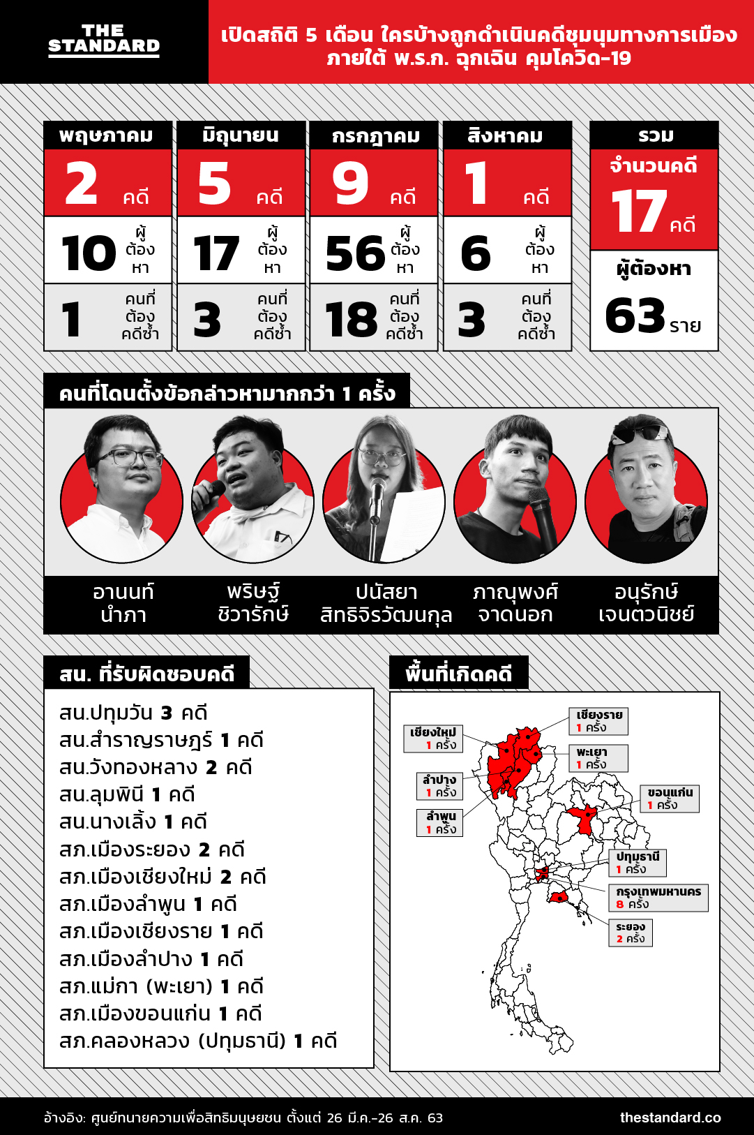 แต่ทว่าศูนย์ทนายความเพื่อสิทธิมนุษยชนได้รายงานตัวเลขผู้ถูกดำเนินคดีในห้วงที่มีการประกาศใช้ พ.ร.ก. ฉุกเฉิน ตั้งแต่ วันที่ 26 มีนาคม 2563 จนถึงวันที่ 26 สิงหาคม 2563 รวม 5 เดือน เนื่องจากชุมนุมทางการเมือง มีจำนวนถึง 63 ราย รวม 17 คดี