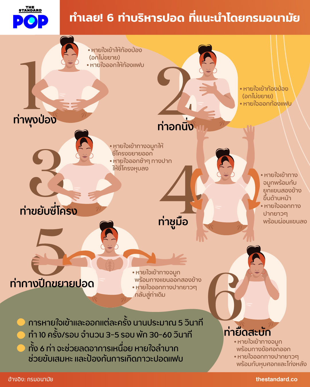 - ทั้ง 6 ท่า จะช่วยลดอาการเหนื่อย หายใจลำบาก ช่วยขับเสมหะ และป้องกันการเกิดภาวะปอดแฟบ
