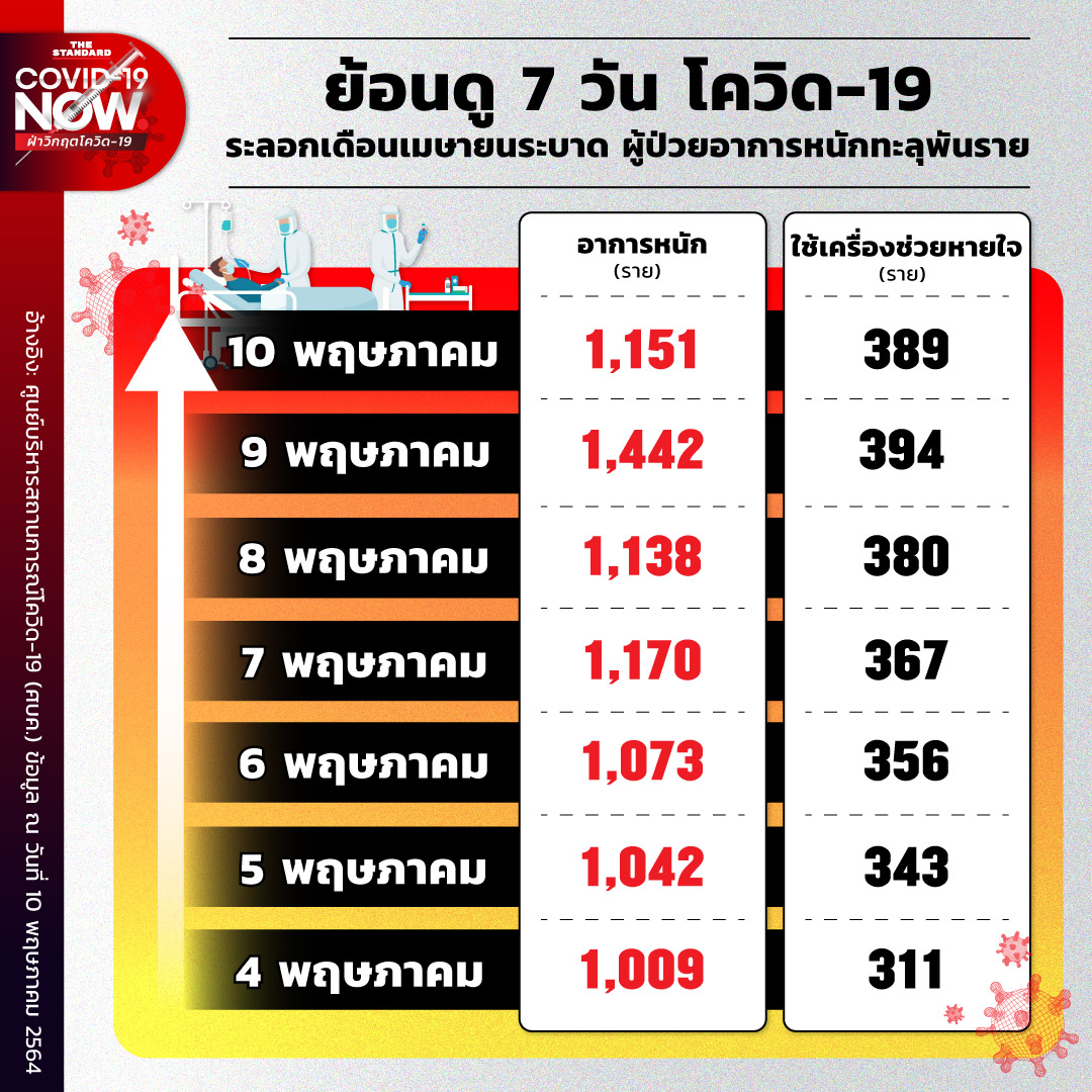 นับตั้งแต่การระบาดของโควิด-19 ระลอกใหม่ หรืออาจเรียกว่าระลอกที่สาม หรือระลอกเดือนเมษายน 2564 ตัวเลขยอดสะสมตั้งวันที่ 1 เมษายน ถึง 10 พฤษภาคม มีจำนวนผู้ป่วยสะสมรวมกัน 56,142 ราย ขณะที่ผู้เสียชีวิตสะสม 327 ราย แต่สองตัวเลขสถานการณ์ประจำวันที่น่าสนใจคือ ผู้ป่วยอาการหนักและผู้ป่วยที่ใช้เครื่องช่วยหายใจเพิ่มขึ้นต่อเนื่องในรอบ 7 วัน โดยทะลุหลักพันรายต่อเนื่อง